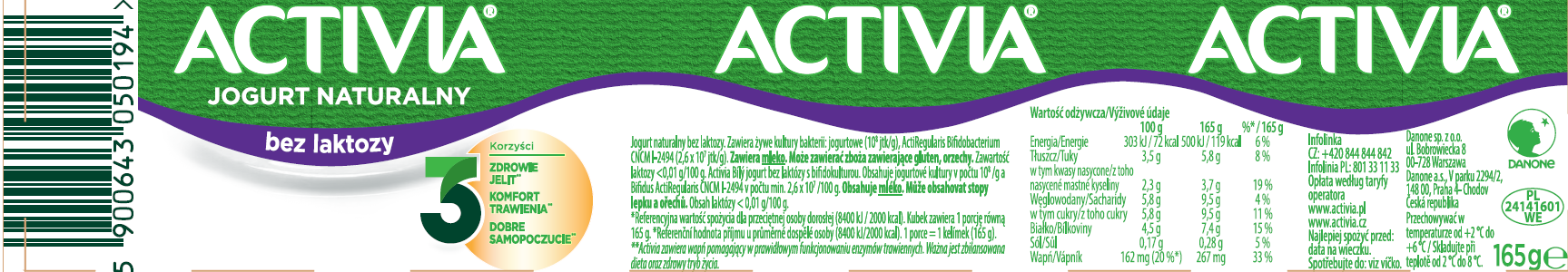 | Składniki | Jogurt bez laktozy. zawiera żywe kultury bakterii: jogurtowe (108 jtk/g), actiregularis bifidobacterium cncm i-2494 (2,6 x 107 jtk/g). zawiera mleko. może zawierać zboża zawierające gluten, orzechy. zawartość laktozy < 0,01 g / 100 g. |