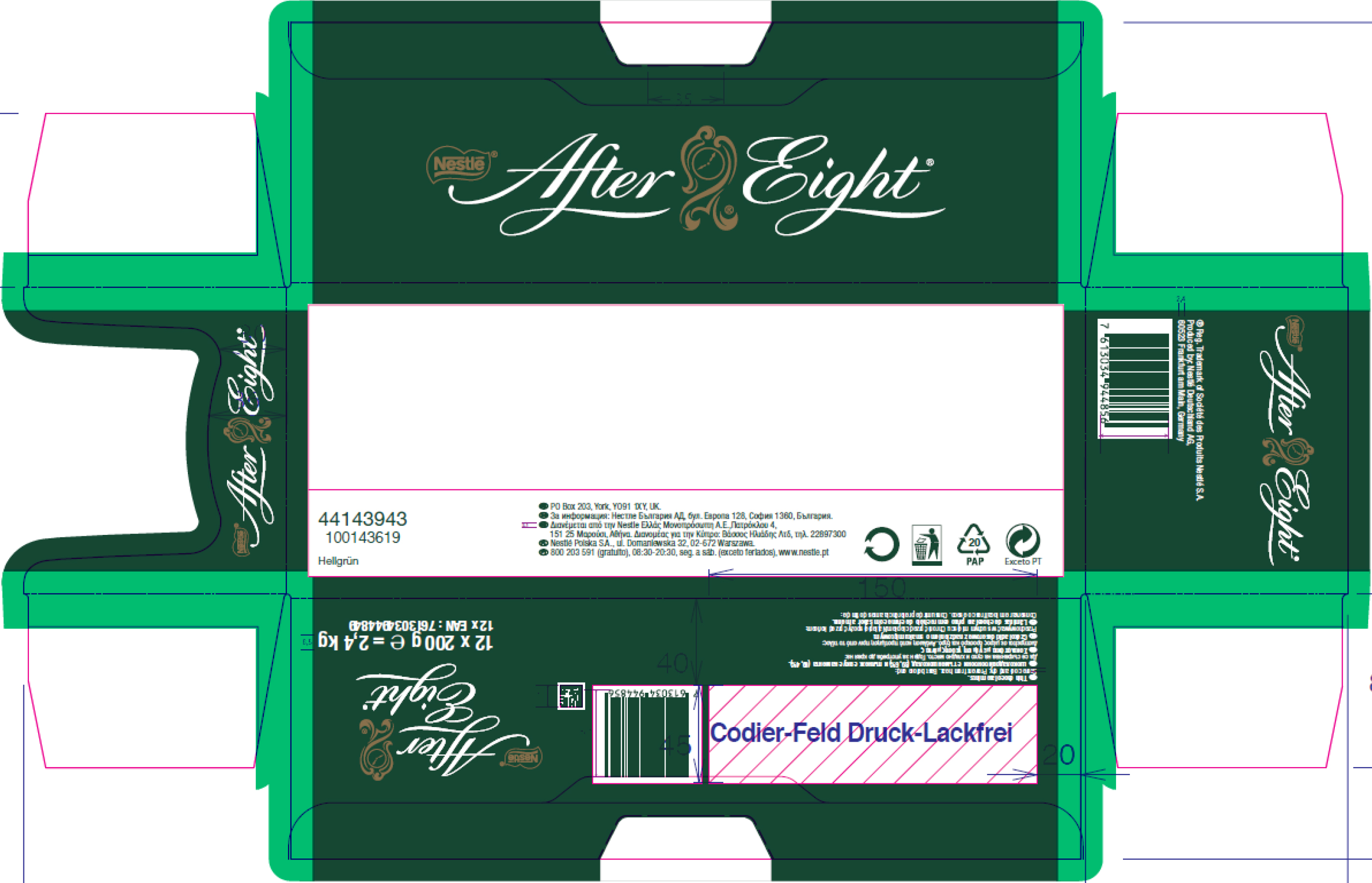 After Eight to ekskluzywne płatki z aksamitnej, gorzkiej czekolady z delikatnym i orzeźwiającym miętowym nadzieniem. Najlepszej jakości czekolada deserowa w połączeniu z miętą tworzy wspaniałą kompozycję smaków. Doskonale sprawdzą się na prezent lub jako słodka przyjemność w gronie najbliższych. Delektowanie się wyśmienitym smakiem pralin After Eight umili celebrację każdej ważnej i niezwykłej chwili.