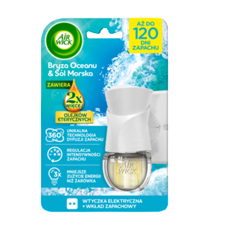 Air Wick elektryczny odświeżacz powietrza o zapachu Bryza Oceanu & Sól Morska komplet 19ml; Poczuj zapach bryzy oceanu i soli morskiej z nutami aromatycznych cytrusów połączonych z ciepłem drewna, cedru i bursztynu, które pomogą stworzyć orzeźwiającą atmosferę w swoim domu.; ZALETY PRODUKTU: -2x więcej olejków eterycznych*; -neutralizuje nieprzyjemne zapachy; -aż do 120 dni zapachu**; -5 poziomów intensywności zapachu do wyboru; -unikalna technologia dyfuzji zapachu 360; -w skład zestawu wchodzą: wtyczka oraz wkład zapachowy; -wygodny i prosty w obsłudze; -idealny do pokoju dziennego, salonu, łazienki oraz kuchni; Aż do 120 dni zapachu**. 5 poziomów intensywności pozwala Ci dowolnie dopasować intensywność zapachu w pomieszczeniu tak, jak lubisz. Elektryczny odświeżacz powietrza Air Wick skutecznie eliminuje nieprzyjemne zapachy i jest wyjątkowo trwały. *Zapach wzbogacony 2 razy większą ilością olejków eterycznych w porównaniu do poprzedniej formuły Air Wick. **Przy najniższym poziomie zużycia przez 12 godzin dziennie.; NUTY ZAPACHOWE: Nuty głowy: Grejpfrut, Skórka cytrynowa, Aldehydy; Nuty serca: Aromatyczne, Wodne, Lotos; Nuty bazy: Mokre drewno, Cedr, Bursztyn; SPOSÓB UŻYCIA: Używaj wyłącznie z wkładami Air Wick lub Botanica. 1. Zdejmij plastikową nakrętkę z wkładu.; 2. Umieść wkład w dolnej części wtyczki, aż usłyszysz kliknięcie. Upewnij się, że wkład cały czas znajduje się w pozycji pionowej.; 3. Umieść wtyczkę w gniazdku.; 4. Aby zwiększyć lub zmniejszyć intensywność zapachu, przekręć tarczę na górze wtyczki. Największy znak = największa intensywność.;