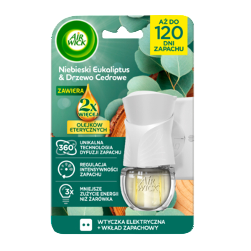 Air Wick elektryczny odświeżacz powietrza o zapachu Niebieski Eukaliptus & Drzewo Cedrowe komplet 19ml. Otocz się orzeźwiającą, aromatyczną mieszanką niebieskiego eukaliptusa i drzewa cedrowego nasyconą świeżością wodnych aromatów i cytryny, uzupełnioną ciepłymi nutami drewna i bogatego piżma.; ZALETY PRODUKTU: -2x więcej olejków eterycznych*; -neutralizuje nieprzyjemne zapachy; -aż do 120 dni zapachu**; -5 poziomów intensywności zapachu do wyboru; -unikalna technologia dyfuzji zapachu 360; -w skład zestawu wchodzą: wtyczka oraz wkład zapachowy; -wygodny i prosty w obsłudze; -idealny do pokoju dziennego, salonu, łazienki oraz kuchni; Aż do 120 dni zapachu**. 5 poziomów intensywności pozwala Ci dowolnie dopasować intensywność zapachu w pomieszczeniu tak, jak lubisz. Elektryczny odświeżacz powietrza Air Wick skutecznie eliminuje nieprzyjemne zapachy i jest wyjątkowo trwały. *Zapach wzbogacony 2 razy większą ilością olejków eterycznych w porównaniu do poprzedniej formuły Air Wick. **Przy najniższym poziomie zużycia przez 12 godzin dziennie.; NUTY ZAPACHOWE: Nuty głowy: Skórka cytrynowa, Lawenda, Eukaliptus; Nuty serca: Białe szałwia, Sosna, Geranium; Nuty bazy: Olejek cyprysowy, Paczuli, Kaszmirowe piżmo; SPOSÓB UŻYCIA: Używaj wyłącznie z wkładami Air Wick lub Botanica. 1. Zdejmij plastikową nakrętkę z wkładu.; 2. Umieść wkład w dolnej części wtyczki, aż usłyszysz kliknięcie. Upewnij się, że wkład cały czas znajduje się w pozycji pionowej.; 3. Umieść wtyczkę w gniazdku.; 4. Aby zwiększyć lub zmniejszyć intensywność zapachu, przekręć tarczę na górze wtyczki. Największy znak = największa intensywność.;