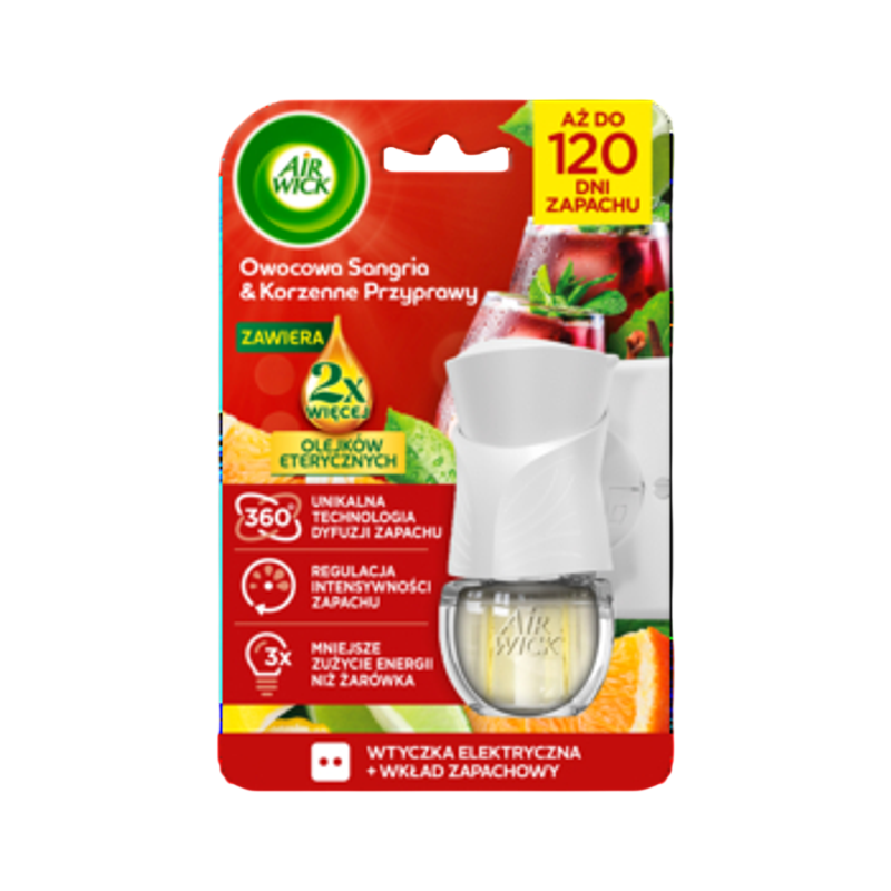 Air Wick elektryczny odświeżacz powietrza o zapachu Owocowa Sangria & Korzenne Przyprawy komplet 19ml.Poczuj słodki zapach sangrii z owocami wzbogacony aromatycznymi przyprawami..; ZALETY PRODUKTU: -2x więcej olejków eterycznych*; -neutralizuje nieprzyjemne zapachy; -aż do 120 dni zapachu**; -5 poziomów intensywności zapachu do wyboru; -unikalna technologia dyfuzji zapachu 360; -w skład zestawu wchodzą: wtyczka oraz wkład zapachowy; -wygodny i prosty w obsłudze; -idealny do pokoju dziennego, salonu, łazienki oraz kuchni; Aż do 120 dni zapachu**. 5 poziomów intensywności pozwala Ci dowolnie dopasować intensywność zapachu w pomieszczeniu tak, jak lubisz. Elektryczny odświeżacz powietrza Air Wick skutecznie eliminuje nieprzyjemne zapachy i jest wyjątkowo trwały. *Zapach wzbogacony 2 razy większą ilością olejków eterycznych w porównaniu do poprzedniej formuły Air Wick. **Przy najniższym poziomie zużycia przez 12 godzin dziennie.; NUTY ZAPACHOWE: Nuty głowy: Jabłko, Pomarańcz, Czerwone Owoce; Nuty serca: Przyprawy, Cynamon, Goździki; Nuty bazy: Drzewne, Praliny, Wanilia; SPOSÓB UŻYCIA: Używaj wyłącznie z wkładami Air Wick lub Botanica. 1. Zdejmij plastikową nakrętkę z wkładu.; 2. Umieść wkład w dolnej części wtyczki, aż usłyszysz kliknięcie. Upewnij się, że wkład cały czas znajduje się w pozycji pionowej.; 3. Umieść wtyczkę w gniazdku.; 4. Aby zwiększyć lub zmniejszyć intensywność zapachu, przekręć tarczę na górze wtyczki. Największy znak = największa intensywność.;