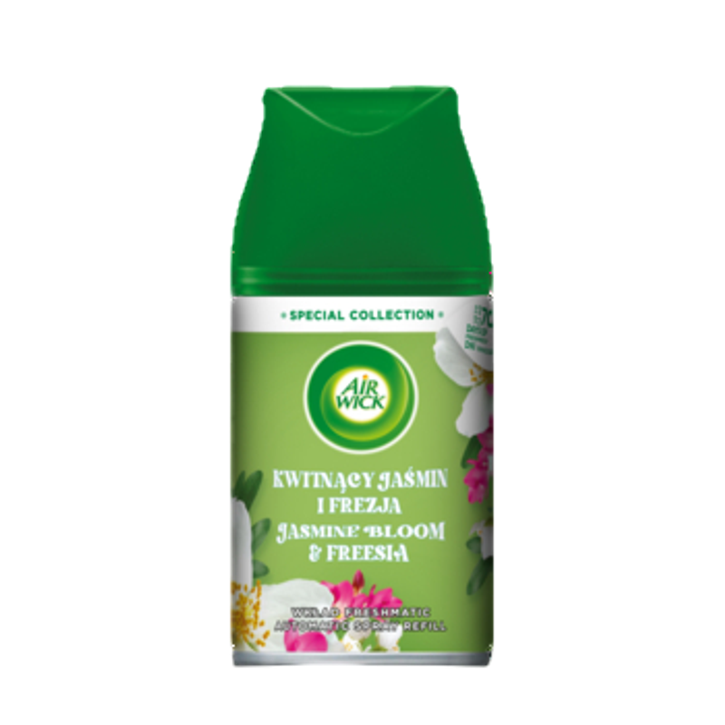 Przenieś się do spokojnego ogrodu i daj się otulić aromatowi świeżych, kwitnących kwiatów jaśminu oraz frezji. Air Wick zaprasza Cię do niezwykłą wyprawę do świata zapachu. W perfumiarskim kodzie nuty jaśminu dodają romantyzmu i wdzięku, a ich delikatny aromat pobudza zmysły i otwiera serce na nowe doznania. Frezja natomiast niesie ze sobą powiew rześkości i lekkości, jej zapach kojarzy się z przechadzką wzdłuż ukwieconych rabat w słoneczny dzień. Gdy takie aromaty goszczą w Twoim domu, nic nie zakłóci poczucia zadowolenia i błogości.; Niebezpieczeństwo. Skrajnie łatwopalny aerozol. Pojemnik pod ciśnieniem: Ogrzanie grozi wybuchem. Chronić przed dziećmi. W razie konieczności zasięgnięcia porady lekarza, należy pokazać pojemnik lub etykietę. Przechowywać z dala od źródeł ciepła, gorących powierzchni, źródeł iskrzenia, otwartego ognia i innych źródeł zapłonu. Nie palić. Nie rozpylać nad otwartym ogniem lub innym źródłem zapłonu. Nie przekłuwać ani nie spalać, nawet po zużyciu. W PRZYPADKU DOSTANIA SIĘ DO OCZU: Ostrożnie płukać wodą przez kilka minut. Wyjąć soczewki kontaktowe, jeżeli są i można je łatwo usunąć. Nadal płukać. Chronić przed światłem słonecznym. Nie wystawiać na działanie temperatury przekraczającej 50 °C. Zawiera Linalool i Isoeugenol. Może powodować wystąpienie reakcji alergicznej. Osoby cierpiące na nadwrażliwość zapachową powinny zachować ostrożność przy stosowaniu tego produktu. Odświeżacze powietrza nie mogą zwolnić z przestrzegania zasad postępowania w zakresie higieny. UFI:4FK4-M0QX-F00N-70C8