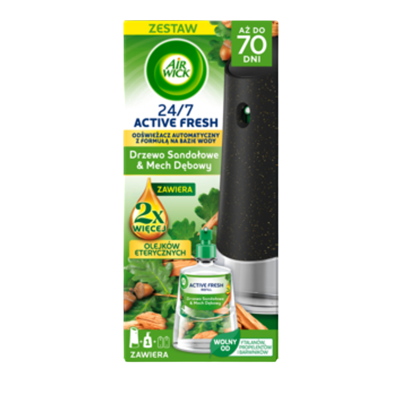 Air Wick Active Fresh Drzewo Sandałowe & Mech Dębowy Komplet 228 ml z podwojoną zawartością olejków eterycznych*; Pozwól by otoczył cię autentyczny zapach natury i wyobraź sobie spacer po lesie, gdy nuty mchu i drzewa sandałowego wypełniają Twój dom.; CECHY PRODUKTU: -Odświeża powietrze i neutralizuje nieprzyjemne zapachy 24/7; -Formuła na bazie wody; -Z naturalnymi olejkami eterycznymi; 95% składników pochodzenia naturalnego; Bez propelentów, ftalanów i barwników; -Regulacja intensywności zapachu z urządzenia; -Przycisk Instant Boost - zapach na życzenie; -Działanie do 70 dni**; -Opakowanie nadające się do recyklingu;