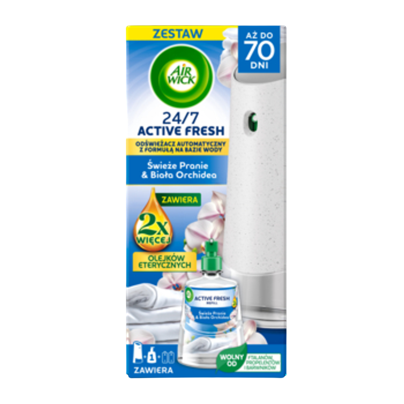 Air Wick Active Fresh Świeże pranie & Biała orchidea Komplet 228 ml z podwojoną zawartością olejków eterycznych*; Wyobraź sobie czysty zapach świeżo wypranej pościeli z nutami białej orchidei i kwiatu pomarańczy z dodatkiem cytrusów, które wniosą do twojego domu zachwycającą świeżość.; CECHY PRODUKTU: -Odświeża powietrze i neutralizuje nieprzyjemne zapachy 24/7; -Formuła na bazie wody; -Z naturalnymi olejkami eterycznymi; -95% składników pochodzenia naturalnego; -Bez propelentów, ftalanów i barwników; -Regulacja intensywności zapachu z urządzenia; -Przycisk Instant Boost - zapach na życzenie; -Działanie do 70 dni**; -Opakowanie nadające się do recyklingu; *Zapach wzbogacony 2 razy większą ilością olejków eterycznych w porównaniu do poprzedniej formuły Air Wick.; NUTY ZAPACHOWE:
