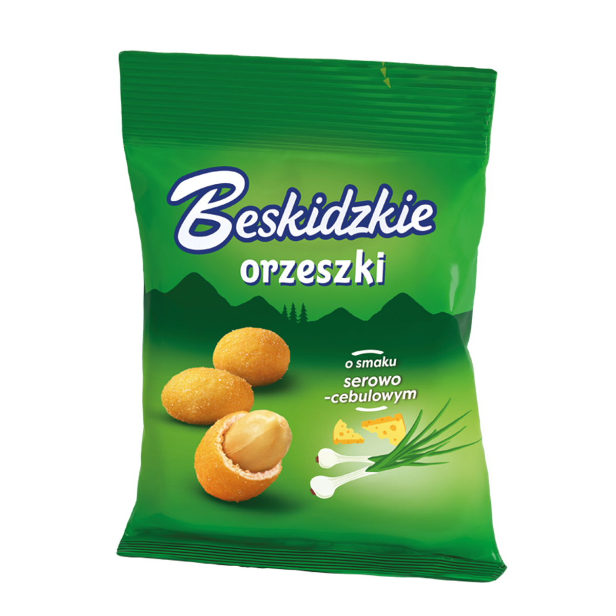 Beskidzkie orzeszki o smaku serowo-cebulowym to wspaniałe połączenie cudownej, chrupiącej skorupki o wyjątkowym smaku, z orzeszkiem arachidowym. Wieczór z książką, dłuższa wycieczka czy spotkanie z bliskimi - beskidzkie orzeszki możesz zabrać ze sobą gdziekolwiek chcesz! Przekąska stworzona zarówno dla młodszych jak i starszych fanów chrupania.