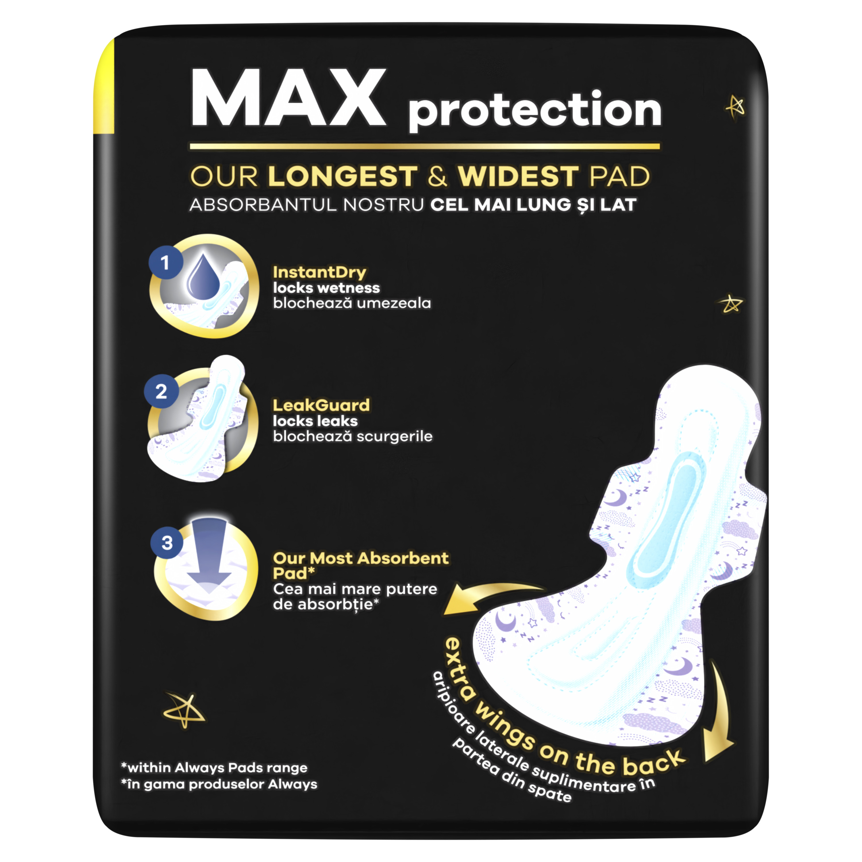 Nie musisz iść na kompromis w kwestii nieprzerwanego snu: podpaski na noc Always Ultimate Night (w rozmiarze 6) ze skrzydełkami zostały zaprojektowane tak, aby oferować maksymalną ochronę, dzięki czemu nie musisz budzić się, aby sprawdzić, czy podpaska przecieka lub by zmienić ją w środku nocy. Nasze najdłuższe i najszersze podpaski z technologią LeakGuard oferują najwyższy poziom chłonności, zapobiegając nocnemu przeciekaniu w trakcie miesiączki. System InstantDry wchłania wilgoć w kilka sekund i utrzymuje ją z dala od Twojej skóry. Podpaski zostały wyposażone w system ComfortFit oraz dodatkowe skrzydełka z tyłu, dzięki którym podpaska pozostaje na miejscu, gdy śpisz, bez względu na zmiany pozycji ciała. Znajdź podpaskę idealnie dopasowaną do Twojego ciała dzięki Always My Fit, systemowi spersonalizowanego dobierania rozmiaru, który pomoże Ci znaleźć najlepsze zabezpieczenie oferowane przez markę Always w czasie okresu, zależnie od intensywności miesiączki i rozmiaru bielizny, jaki nosisz.