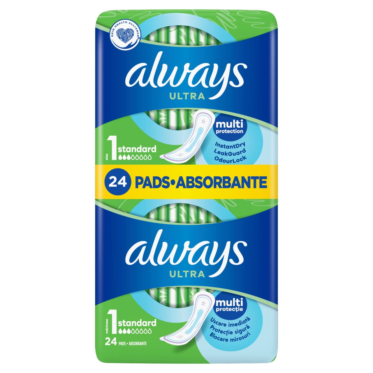 Wybierz dla siebie odpowiednie rozwiązanie – wybierz potrójną ochronę Always: Podpaski Always Ultra Normal (rozmiar 1) wykorzystują najnowszą technologię, która oferuje wszechstronne działanie oraz potrójną ochronę. System InstantDry wchłania wilgoć w kilka sekund i utrzymuje ją z dala od Twojej skóry. Technologia LeakGuard wiąże wilgoć i pomaga zapobiegać przeciekaniu. A technologia OdourLock – która neutralizuje przykre zapachy – sprawia, że możesz czuć się świeżo i czysto podczas miesiączki. Dzięki Always Ultra możesz czuć się pewnie przez cały dzień. Wybierz dla siebie odpowiednie rozwiązanie – wybierz potrójną ochronę Always.