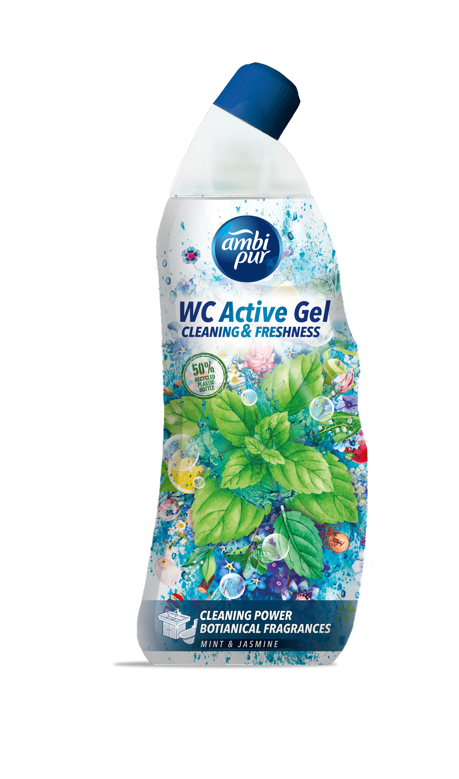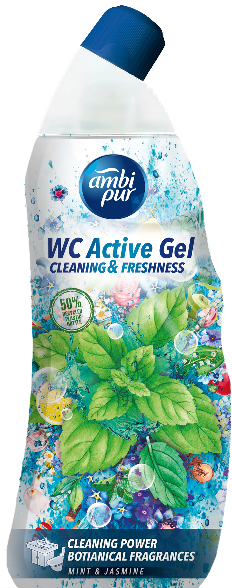 Ambi Pur Płyn Czyszcząco-dezynfekująco-pięknie pachnący 750ml Mięta i Jaśmin Ambi Pur WC Activ Reiniger Gel Mint & Jasmine to perfumowany, aktywny żel do czyszczenia toalet o świeżym miętowo-jasminowym zapachu. Dzięki silnej formule zapobiegającej osadzaniu się kamienia, płyn zapewnia higieniczną czystość, połysk oraz świeżość toalet. Wzbogacony o orzeźwiające zapachy na bazie , roślinnych olejków zapachowych. Czyści zabrudzone powierzchnie oraz usuwa wirusy i grzyby z toalet, umywalek, wanien, brodzików i zlewów. Zawiera technologię anty - zapachową która neutralizuje nieprzyjemne zapachy na czyszczonych powierzchniach. Opakowanie detergentu w 50% pochodzi z plastiku z recyklingu.