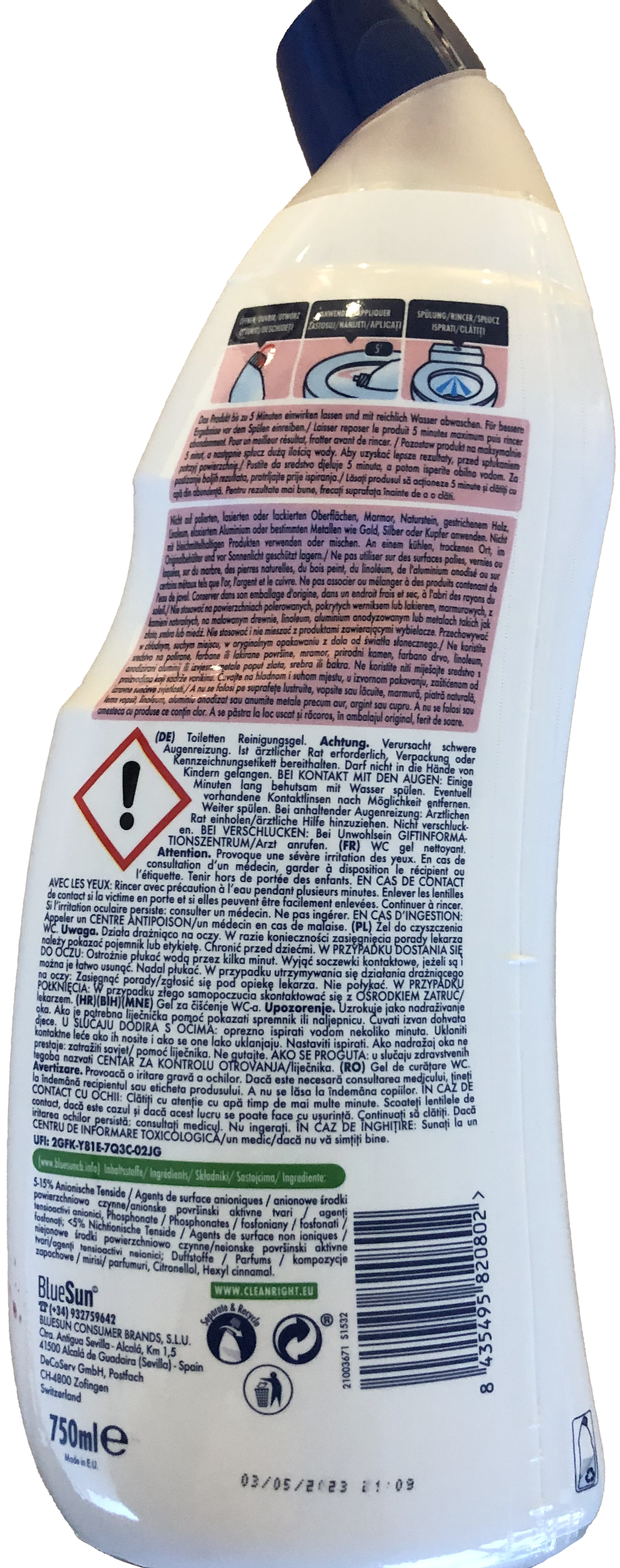 Pozostaw produkt na maksymalnie 5 minut, a następnie spłucz dużą ilością wody. aby uzyskać lepsze rezultaty przed spłukaniem potrzyj powierzchnię.