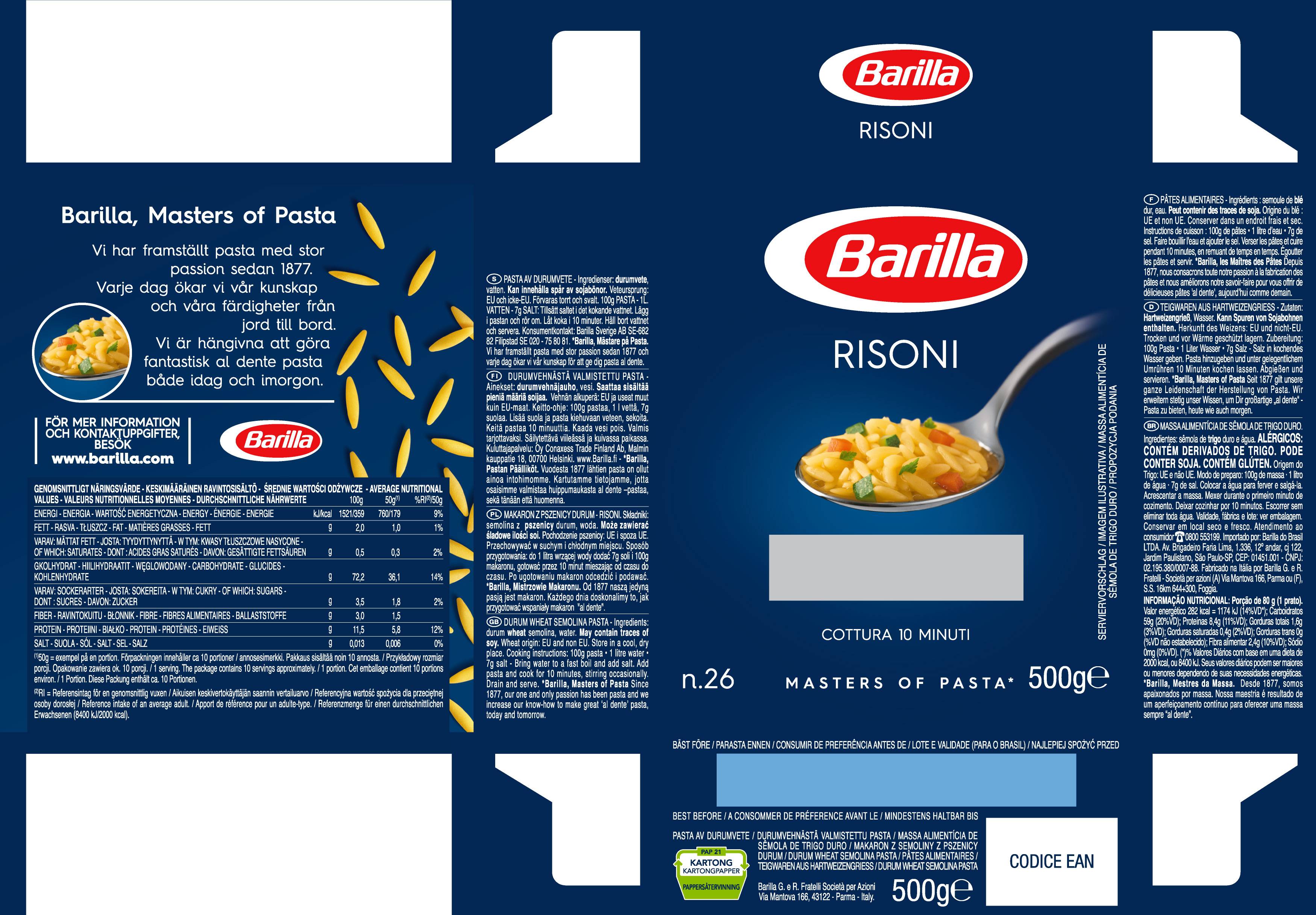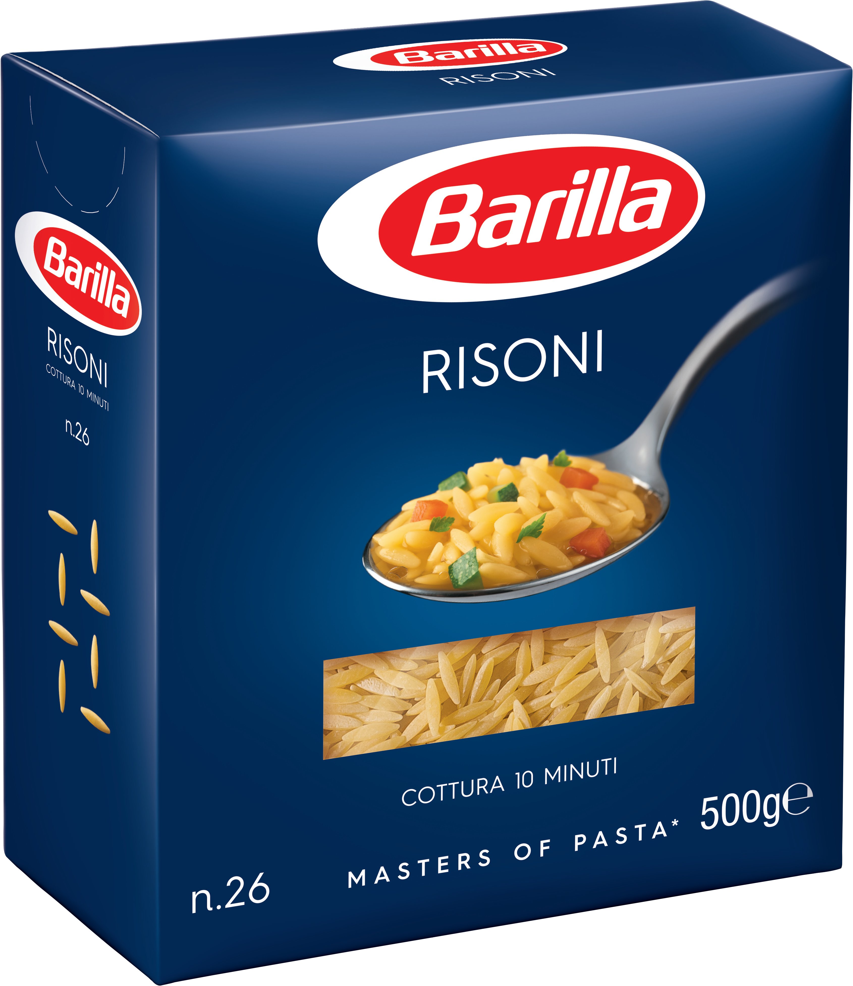 Makaron Barilla wyprodukowany jest z najlepszej jakości surowców, czyli pszenicy twardej (durum), bez której nie można stworzyć prawdziwego makaronu o cenionej powszechnie właściwości al dente. Makaron taki podczas gotowania nie skleja się, jest sprężysty i zachowuje swój kształt nawet, jeśli się gotuje go nieco za długo. Risoni jako drobny kształt to idealny dodatek do zup i bulionów.