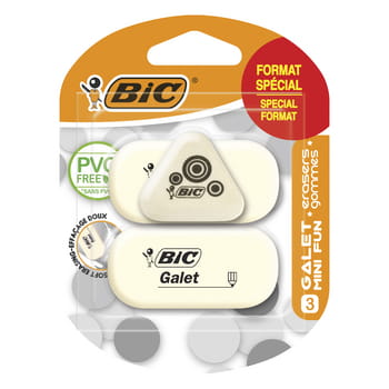BIC Galet+Mini Fun Gumka Blister 2+1 sztuka: • Gumka kauczukowa, • Przeznaczona do ścierania ołówków grafitowych, • Miękka, • Bardzo odporna na wyginanie, • Nie zawiera PVC – polichlorku winylu.