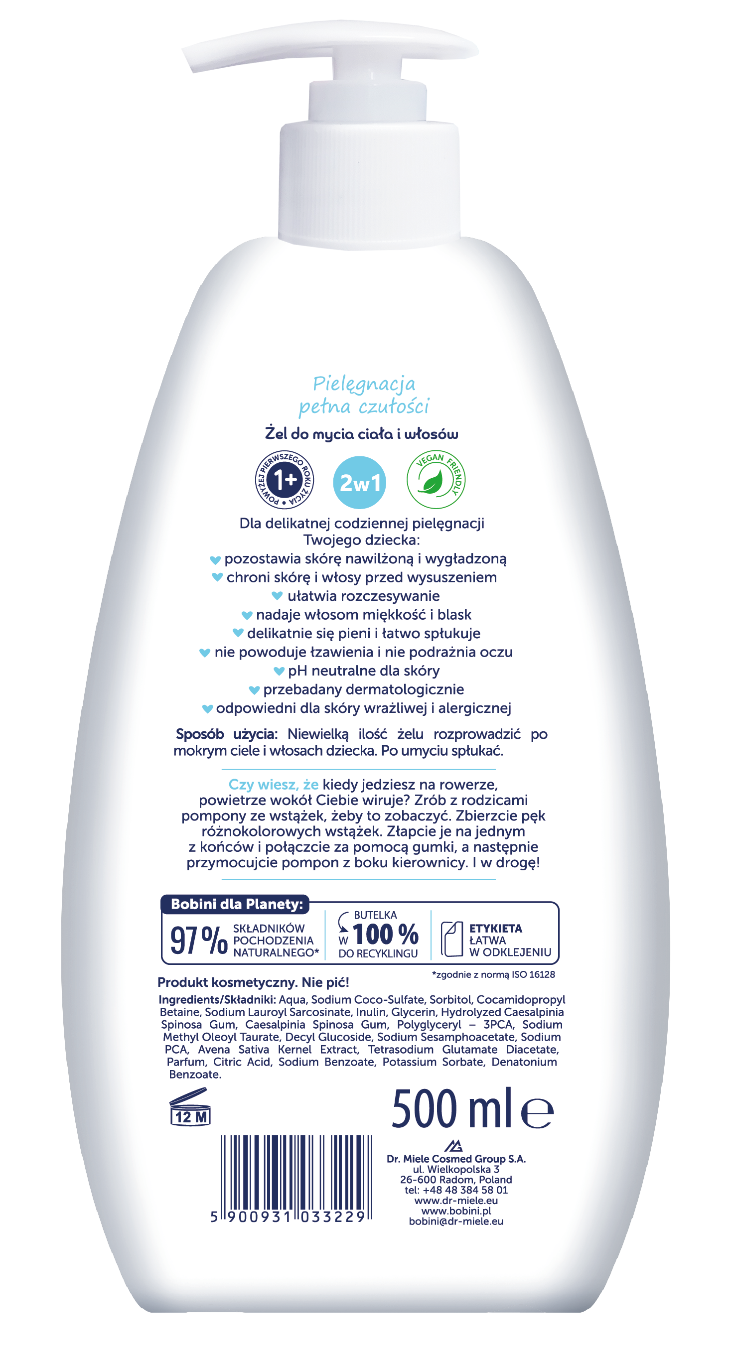 Jako żel do mycia: rozprowadzić niewielką ilość na wilgotnej skórze, naatępnie spłukać ciepłą wodą. Jako szampon: nanieść niewielką ilość na mokre włosy, wmasować, a następnie spłukać.