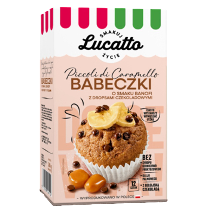 | Instrukcje dotyczące przygotowania | Do przygotowania babeczek potrzebujesz: 2 jaja, 100 ml oleju, 100 ml mleka. sposób przyrządzenia: 1. piekarnik nastaw na 180°c (bez termoobiegu). 2. papierowe papilotki rozłóż na blasze do pieczenia. 3. do wysokiego naczynia dodaj jaja, olej i mleko, a następnie wsyp zawartość torebki z mieszanką ciasta na babeczki. wymieszaj łyżką lub mikserem do uzyskania gładkiej, jednolitej konsystencji (ok. 1 min). 4. ciasto rozłóż równomiernie do papierowych papilotek – do około 1/2 ich wysokości i posyp dropsami czekoladowymi. 5. wstaw natychmiast do rozgrzanego piekarnika. piecz ok. 20 min. |