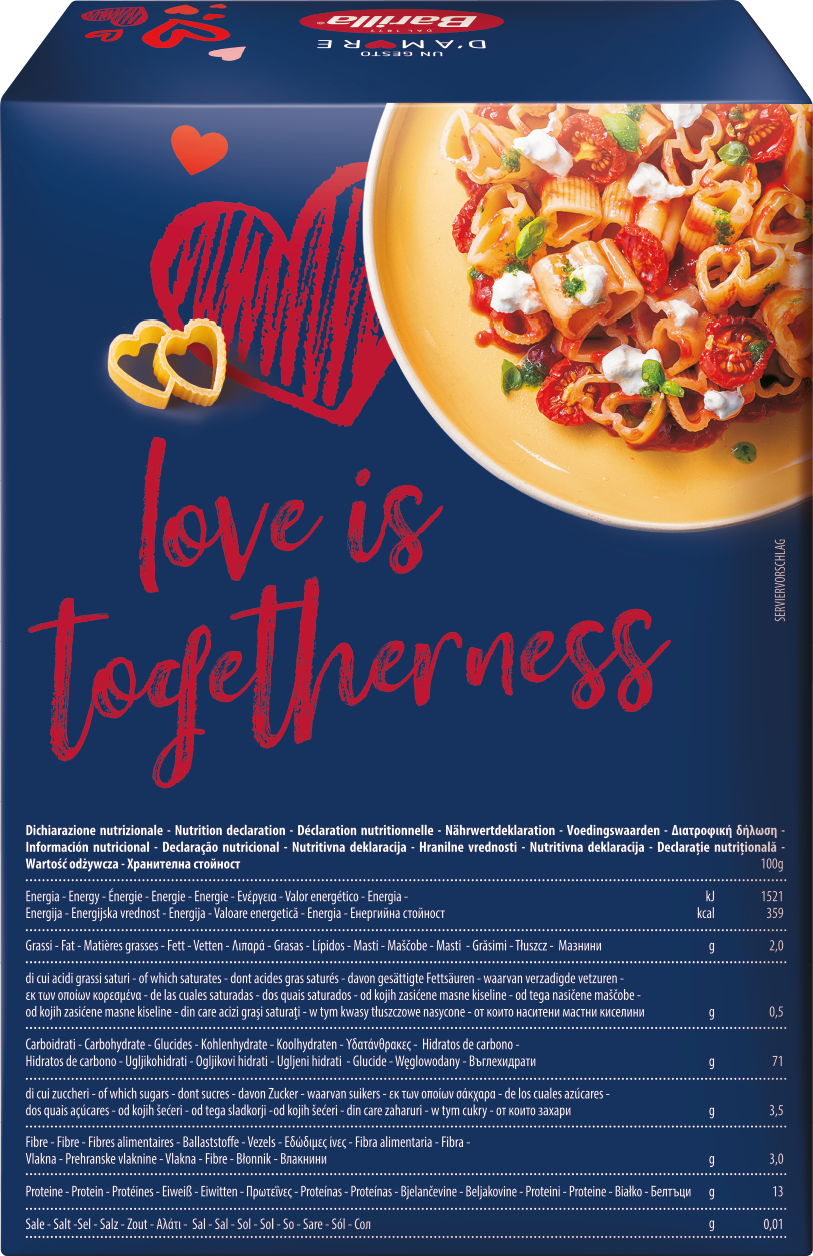 Makaron Barilla Serca – jako globalna marka, która łączy ludzi, Barilla stworzyła specjalny kształt makaronu, na specjalne okazje, aby uczcić wszystkie rodzaje miłości, pomagając ludziom cieszyć się wyjątkowymi chwilami ze swoimi bliskimi. Nasz makaron w kształcie dwóch połączonych ze sobą serc został zaprojektowany tak, aby osiągnąć idealną równowagę między strukturą a sprężystością, dzięki czemu Twój ulubiony kremowy sos idealnie się z nim połączy. Najlepiej smakuje, kiedy dzielisz się nim, z tymi których kochasz.