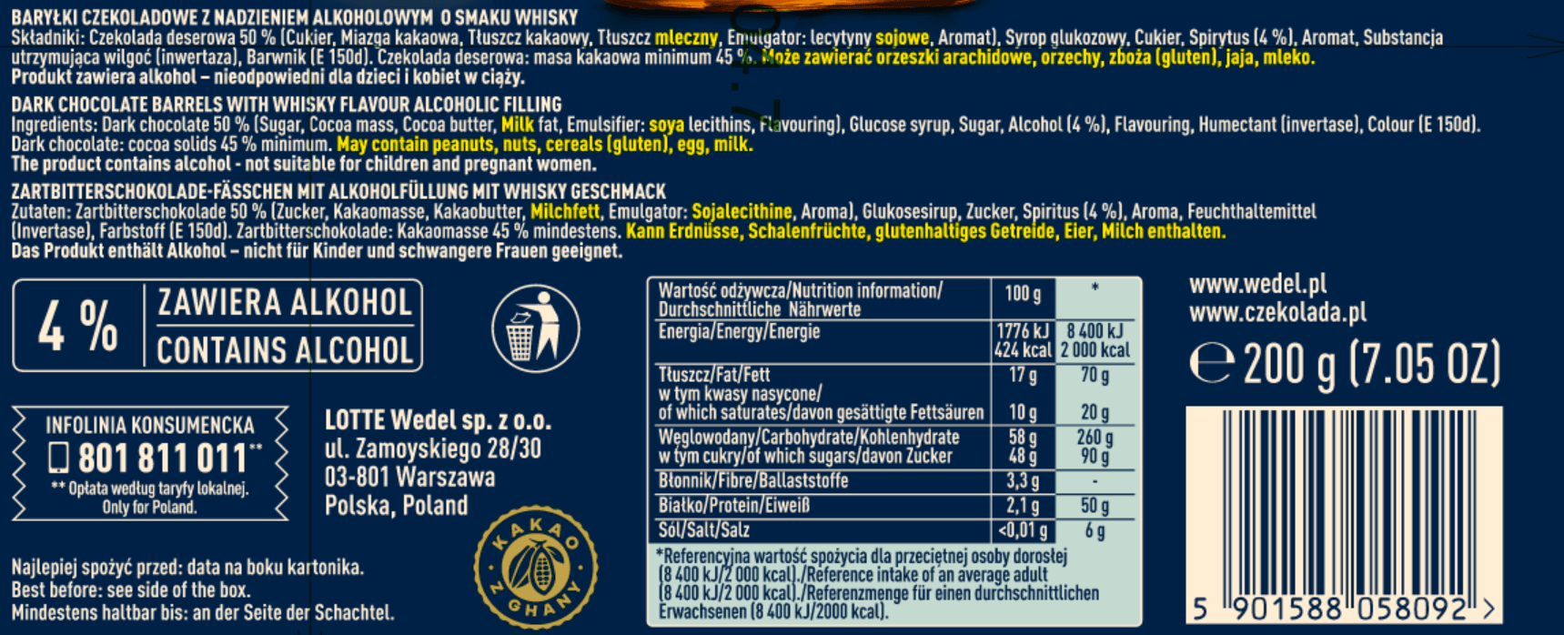 Baryłki o smaku likierów Soplica to połączenie dwóch kultowych marek o długoletniej tradycji. Wedlowska czekolada oraz gęste nadzienie o smaku Wiśni, Porzeczki i Pigwy to gwarancja przyjemności i delektowania się wyrazistością smaków. Dzięki unikalnej recepturze i idealnie dobranym składnikom możesz cieszyć się smakiem inspirowanym Twoimi ulubionymi likierami Soplica w wyjątkowych Baryłkach od Wedla.