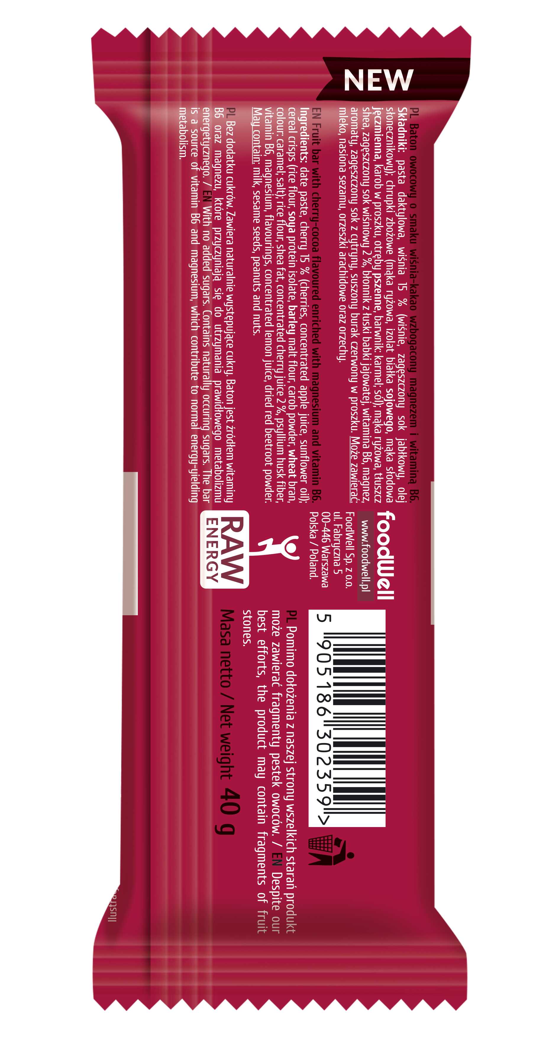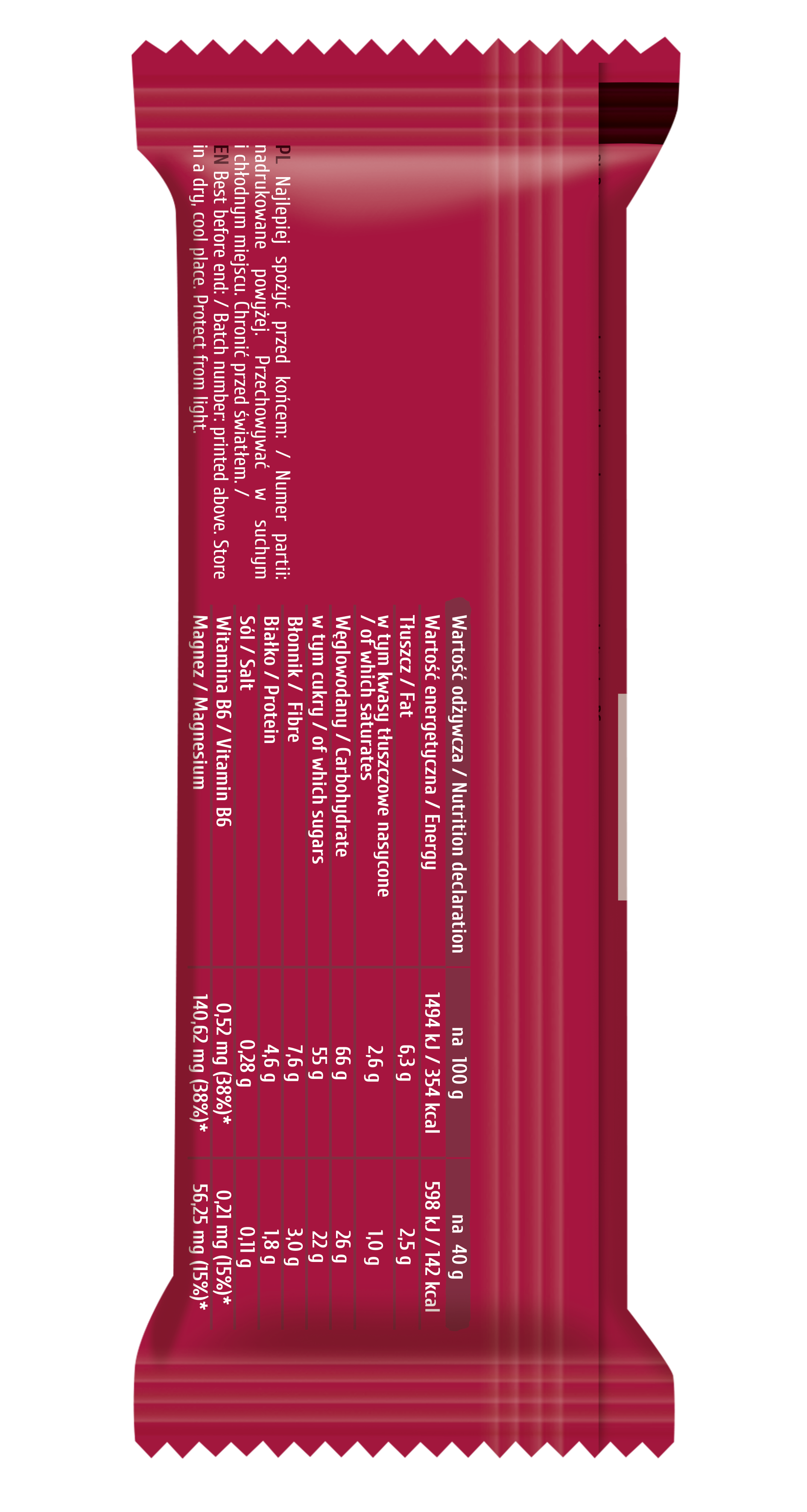 | Składniki | Pasta daktylowa, wiśnia 15 % (wiśnie, zagęszczony sok jabłkowy, olej słonecznikowy); chrupki zbożowe (mąka ryżowa, izolat białka sojowego, mąka słodowa jęczmienna, karob w proszku, otręby pszenne, barwnik: karmel; sól); mąka ryżowa, tłuszcz shea, zagęszczony sok wiśniowy 2 %, błonnik z łuski babki jajowatej, witamina b6, magnez aromaty, zagęszczony sok z cytryny, suszony burak czerwony w proszku. może zawierać mleko, nasiona sezamu, orzeszki arachidowe oraz orzechy. |
