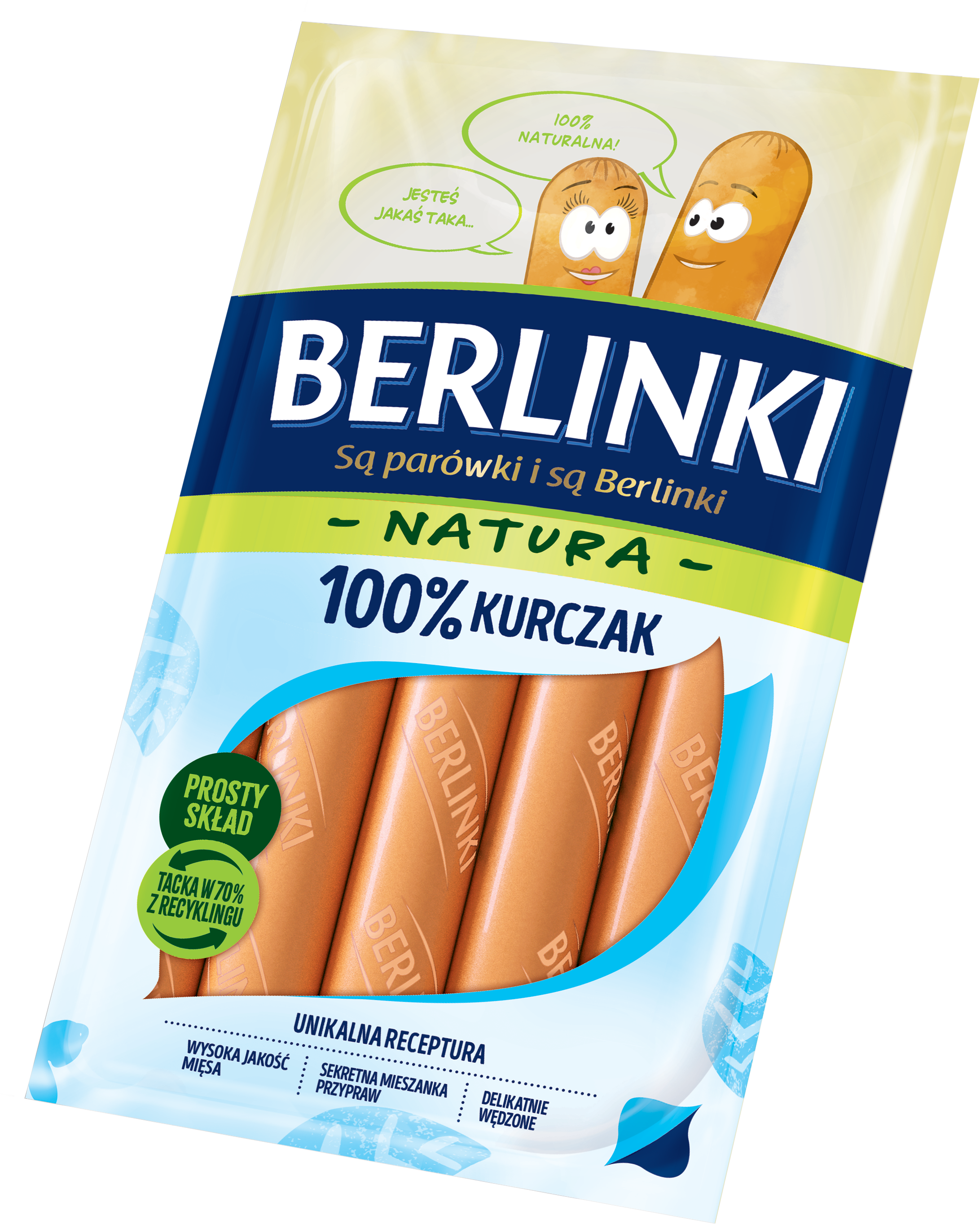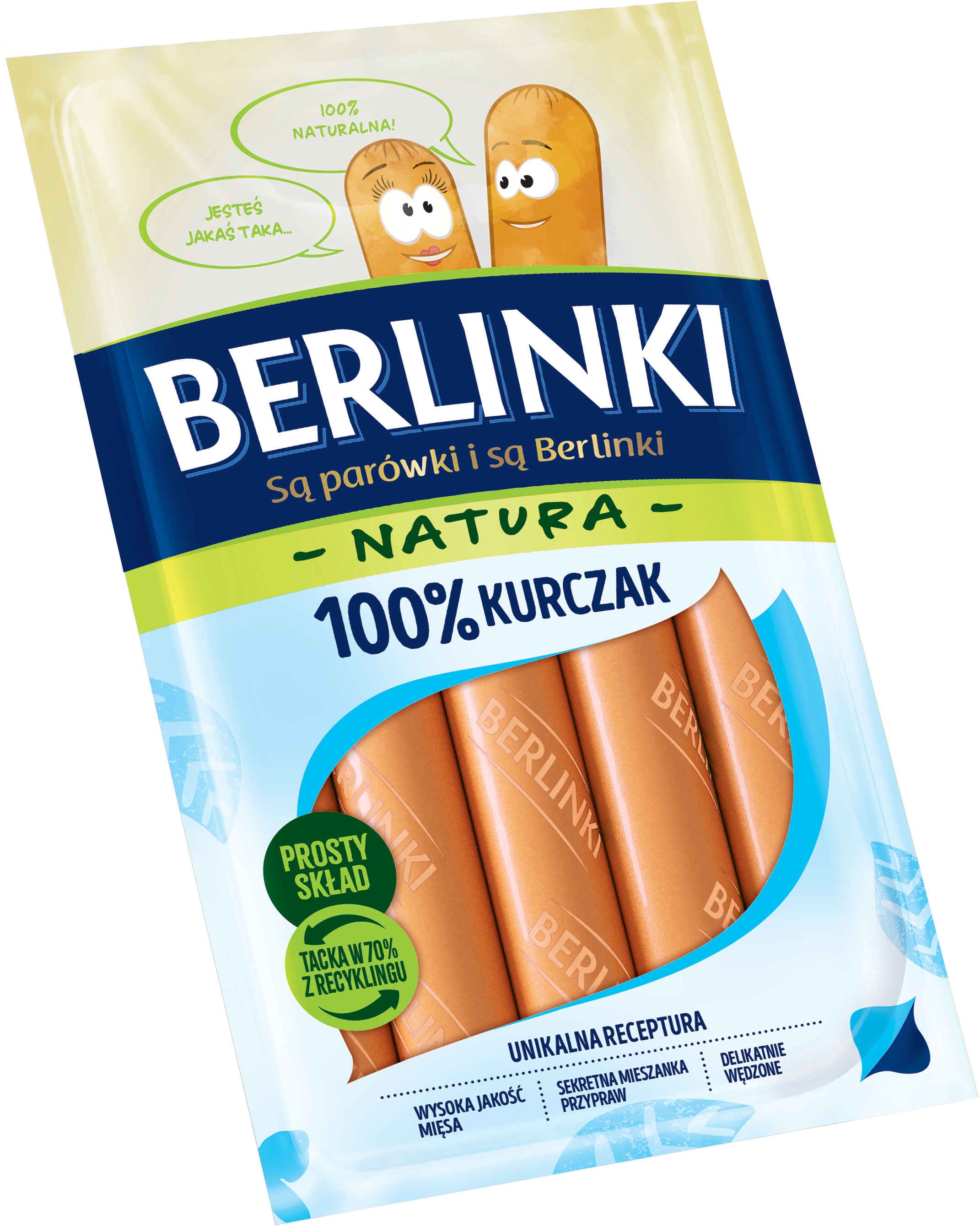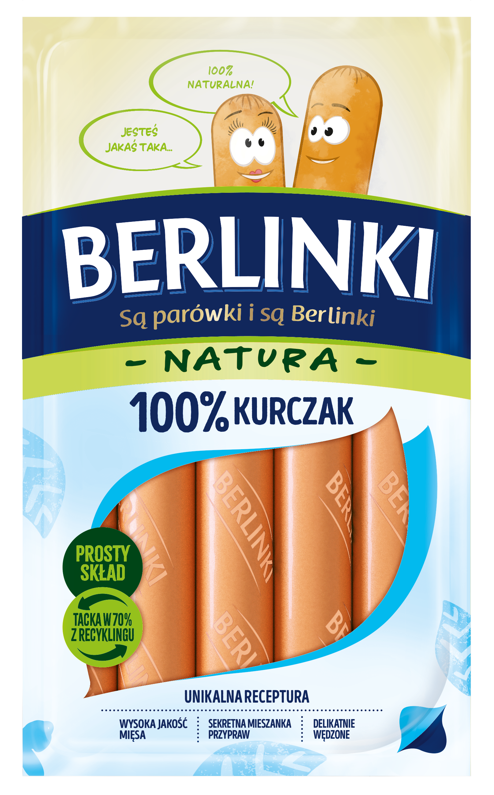 Kiełbasa z kurczaka homogenizowana, niepeklowana, delikatnie wędzona, parzona; przeciętna masa batonu: 32 g.