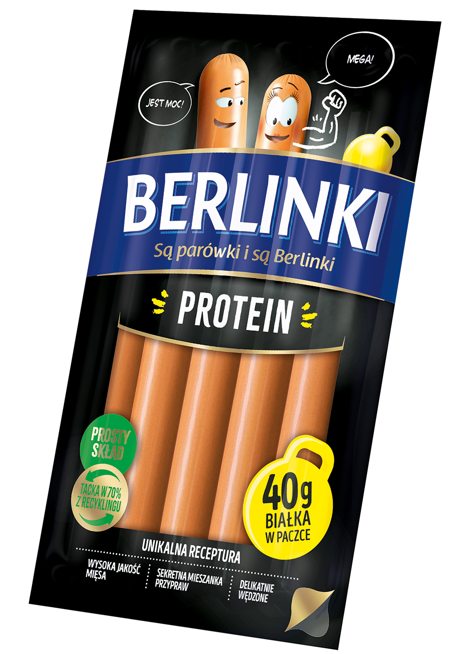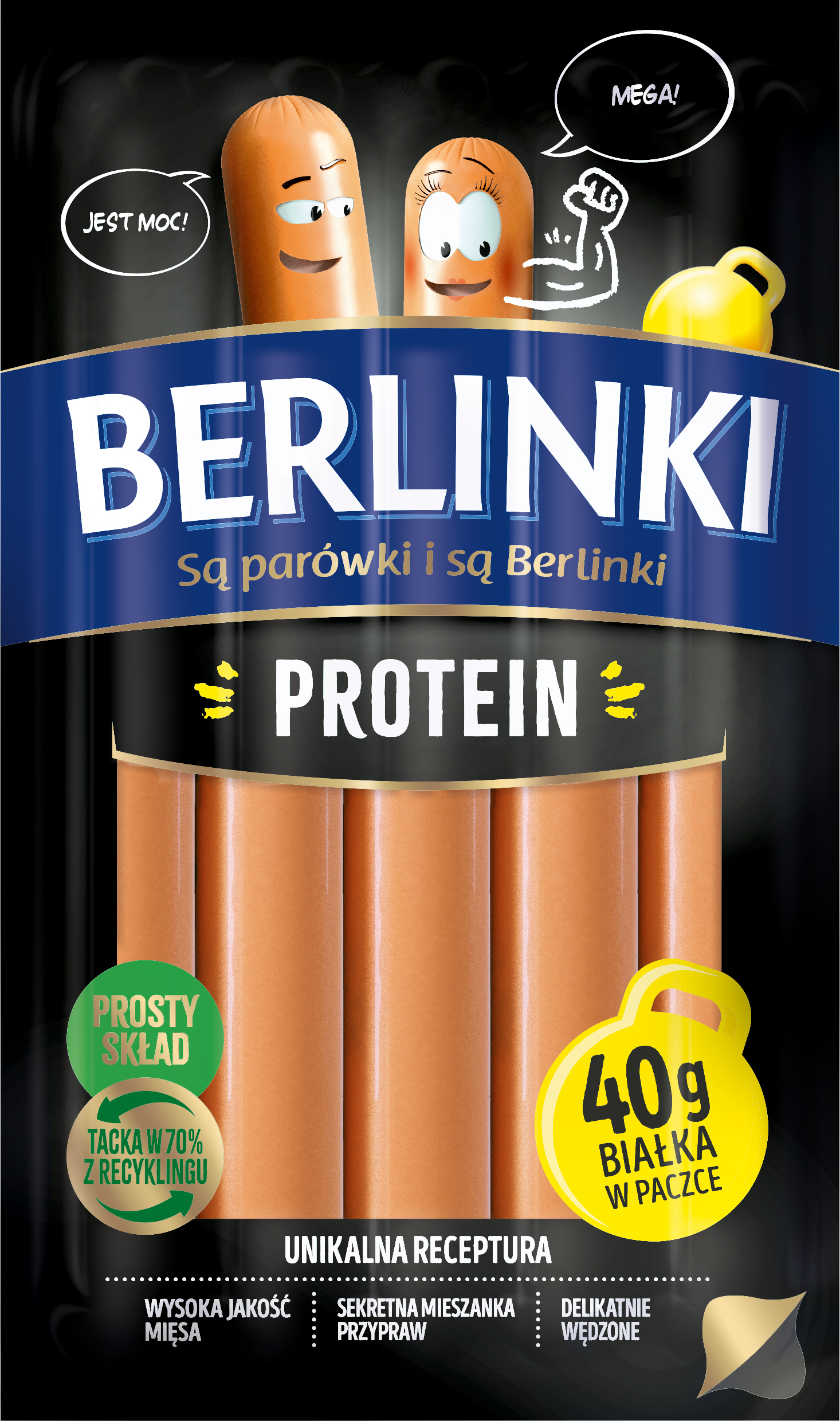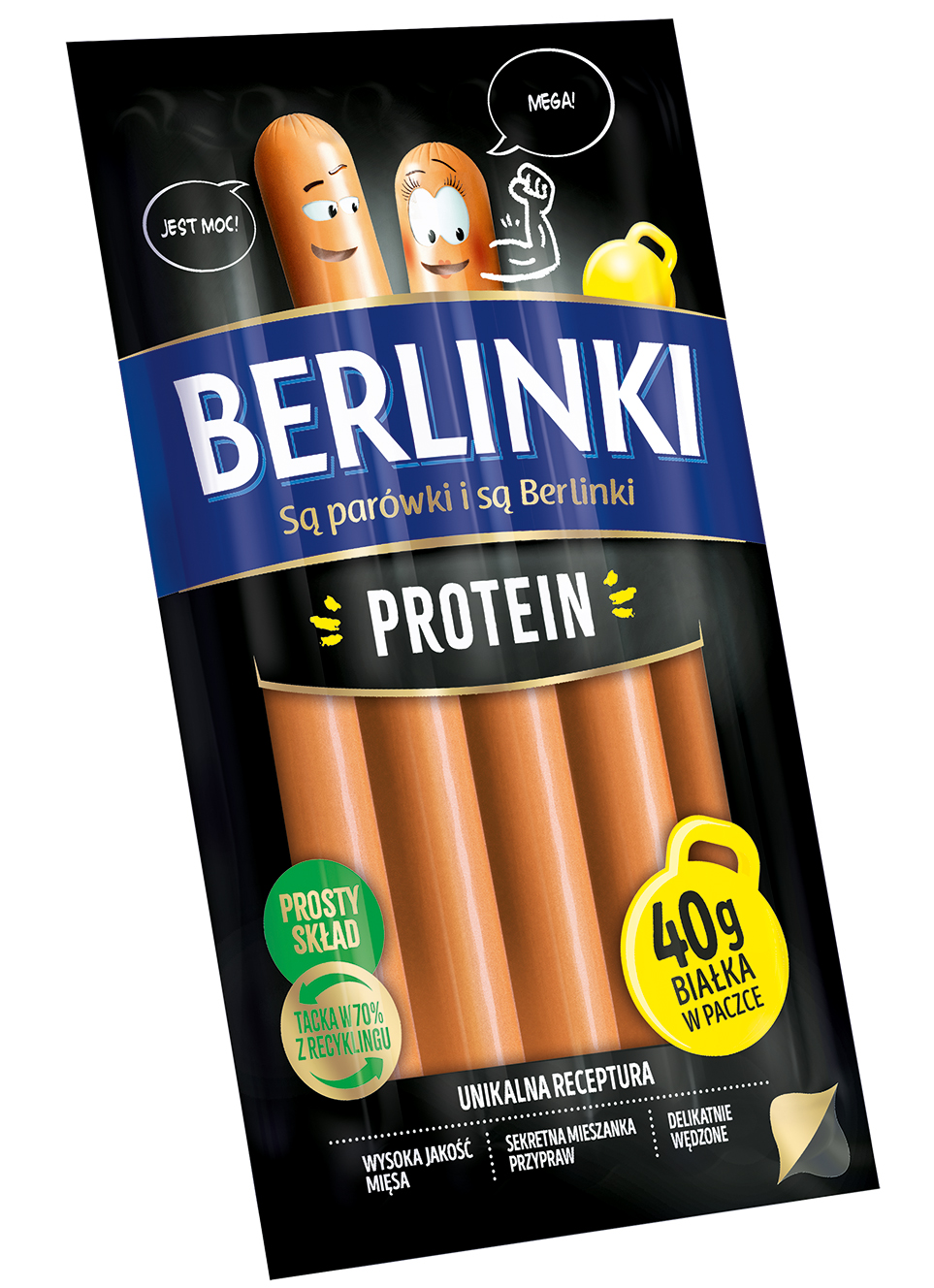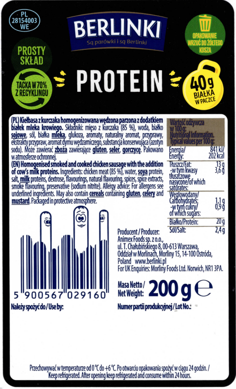 Kiełbasa z kurczaka homogenizowana, peklowana, delikatnie wędzona, parzona; przeciętna masa batonu: 40 g. Opakowanie MAP 200 g.