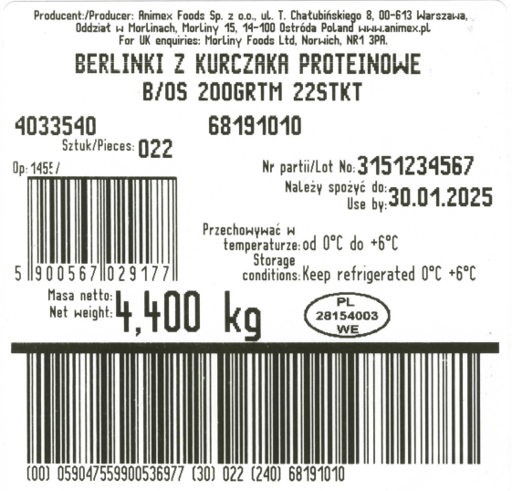 | Adres podmiotu wprowadzającego do obrotu | Nazwa firmy: animex foods sp. z o.o. ul. t. chałubińskiego 8, 00-613 warszawa, oddział w morlinach ulica i numer: morliny 15 kod pocztowy i miasto: 14-100 ostróda pl |