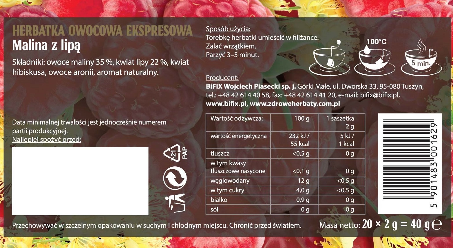 | Składniki | Owoce maliny, kwiat lipy, kwiat hibiskusa, owoce aronii, aromat . |