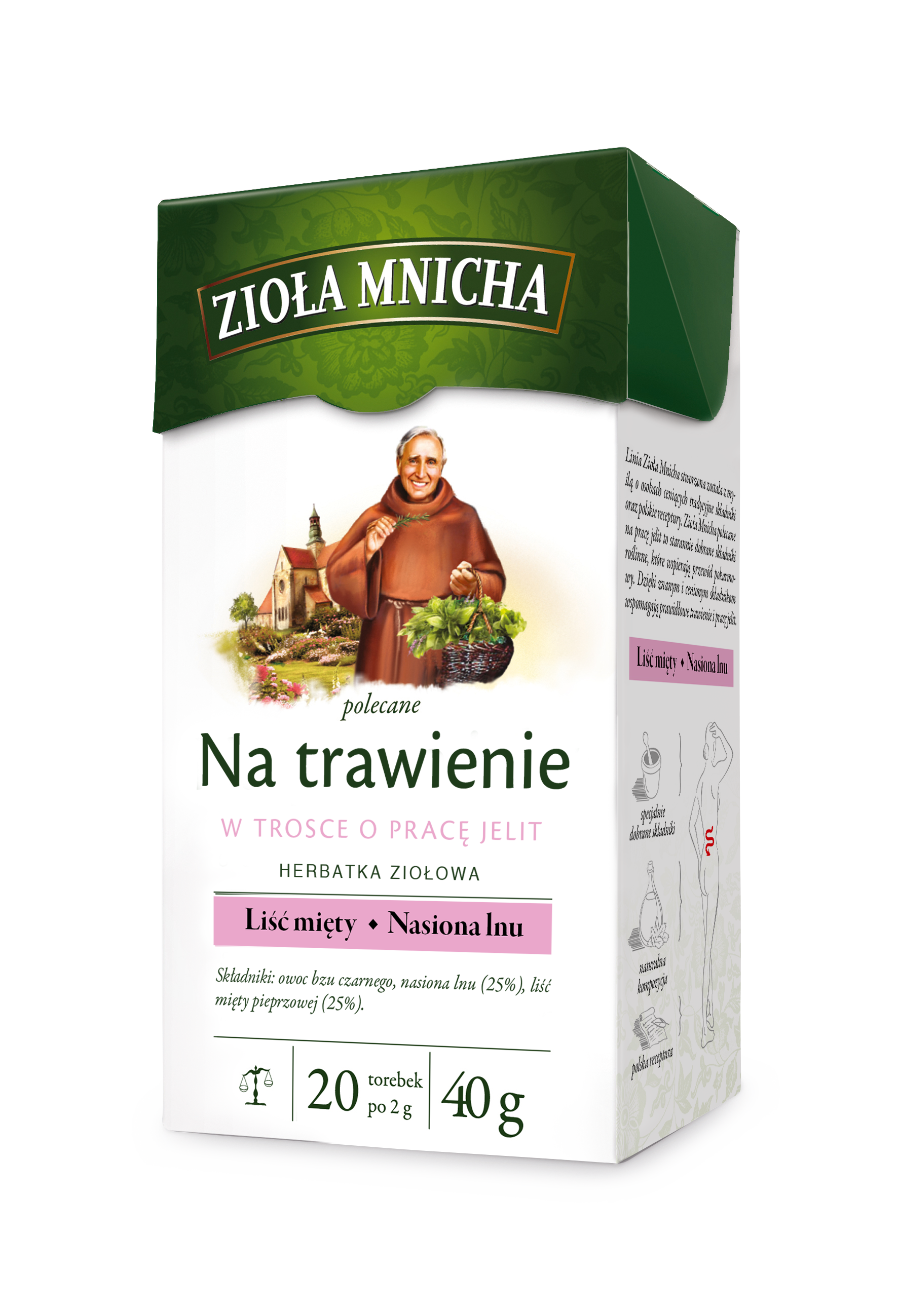 Linia Zioła Mnicha stworzona została z myślą o osobach ceniących składniki oraz polskie receptury. Zioła mnicha polecane na utrzymanie prawidłowego poziomu cholesterolu to starannie dobrane składniki roślinne, których właściwości w sposób wspomagają utrzymanie prawidłowego poziomu cholesterolu we krwi. Smak ziół został złagodzony olejkiem miętowym. Herbata zielona (Camellia sinensis) – najstarszy napój świata, w którym tkwi tajemnica długowieczności, jasności umysłu i aktywności. Tradycja picia tego znakomitego napoju narodziła się w Chinach. Zielona herbata pochodzi z tego samego krzewu co czerwona, różnicą jest poddawanie jej liści tylko lekkiemu parowaniu i suszeniu, pomijając proces fermentacji. Liść karczocha (Cynarae folium) – przyczynia się do utrzymania prawidłowego poziomu lipidów we krwi oraz wpływa korzystnie na prawidłowe funkcjonowanie wątroby. Wspomaga prawidłową pracę serca oraz układu krążenia. Owoc głogu (Crataegi fructus) – znany już w medycynie ludowej z korzystnego działania tonizującego serce i układ krążenia. Działa uspokajająco, często stosowany w przypadku napięcia nerwowego.
