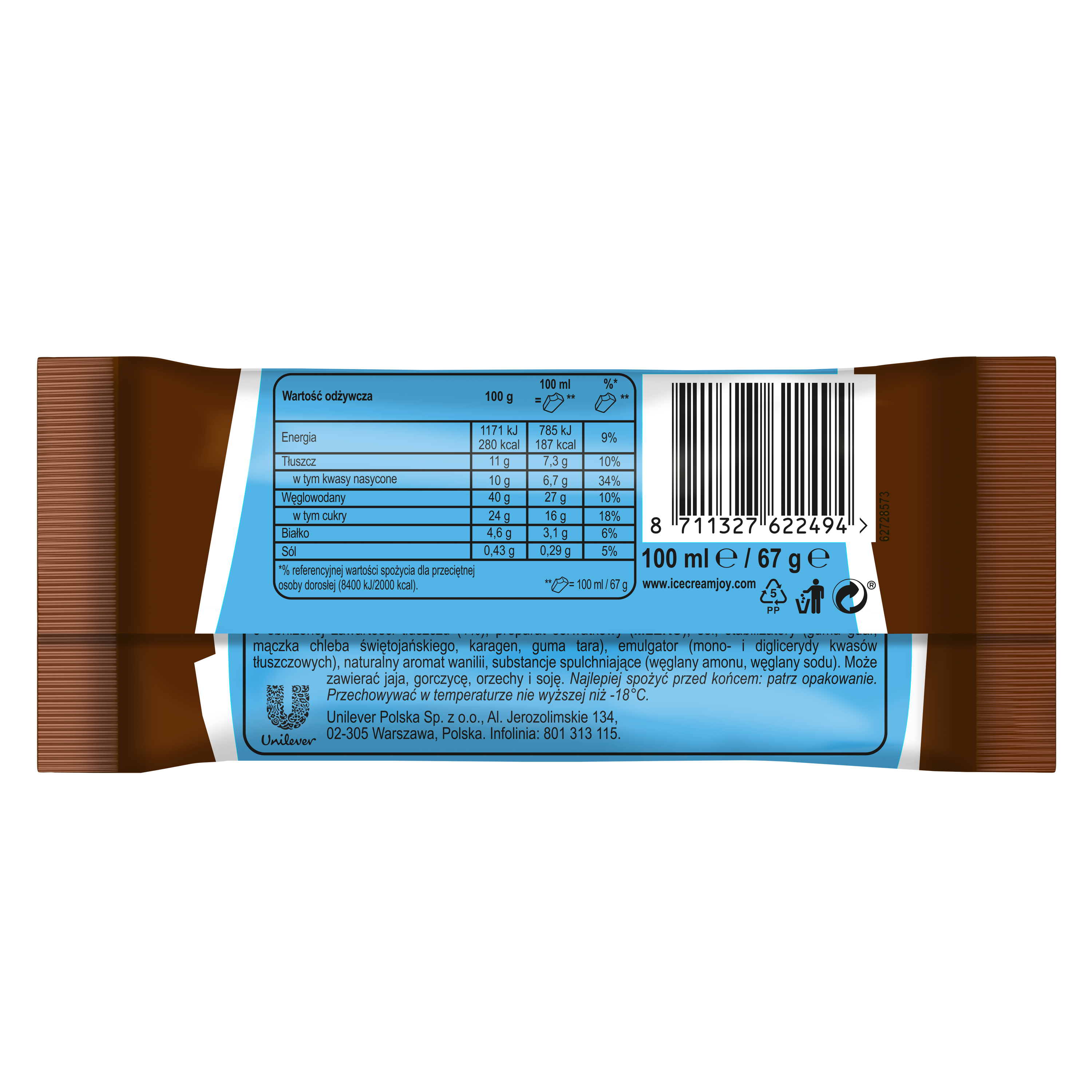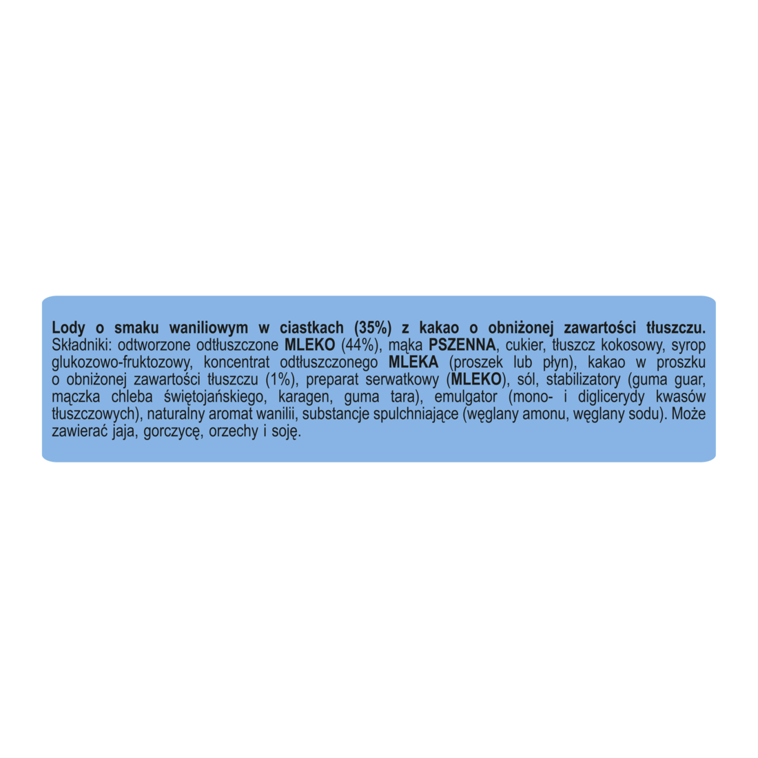 Lody o smaku waniliowym w ciastkach (35%) z kakao o obniżonej zawartości tłuszczu.