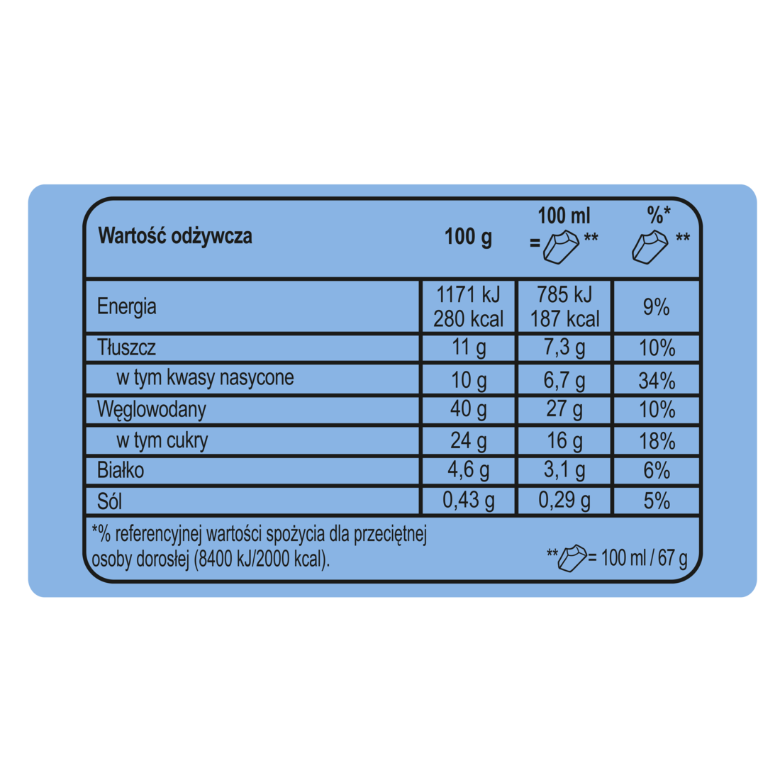 | Składniki | Odtworzone odtłuszczone mleko (44%), mąka pszenna, cukier, tłuszcz kokosowy, syrop glukozowo-fruktozowy, koncentrat odtłuszczonego mleka (proszek lub płyn), kakao w proszku o obniżonej zawartości tłuszczu (1%), preparat serwatkowy (mleko), sól, stabilizatory (guma guar, mączka chleba świętojańskiego, karagen, guma tara), emulgator (mono- i diglicerydy kwasów tłuszczowych), aromat wanilii, substancje spulchniające (węglany amonu, węglany sodu). może zawierać jaja, gorczycę, orzechy i soję. |