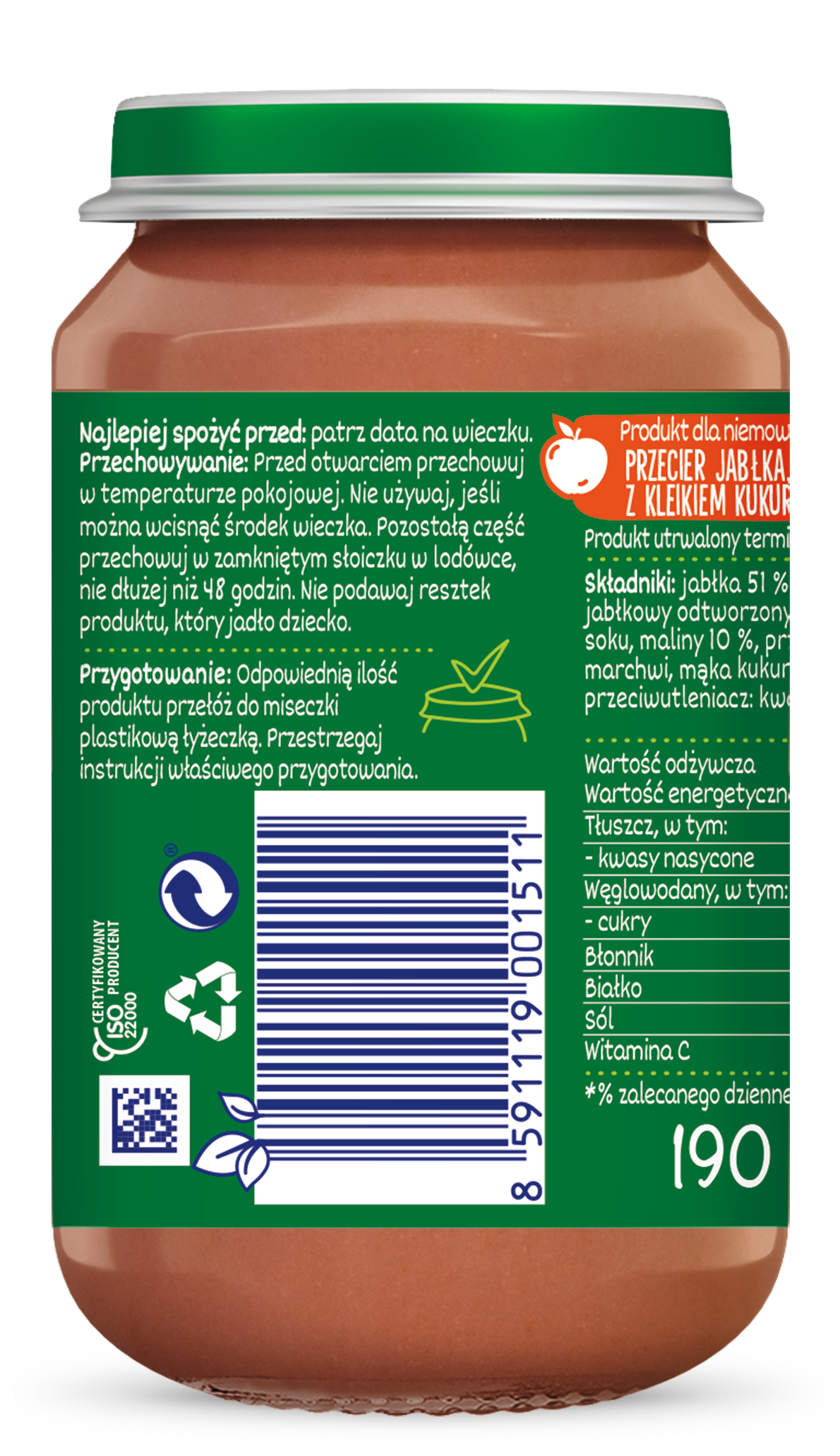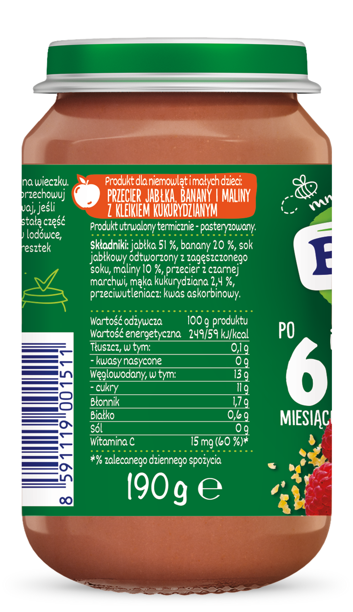 | Składniki | jabłka 51%, banany 20%, sok jabłkowy odtworzony z zagęszczonego soku, maliny 10%, przecier z czarnej marchwi, mąka kukurydziana 2,4%, przeciwutleniacz: kwas askorbinowy. |