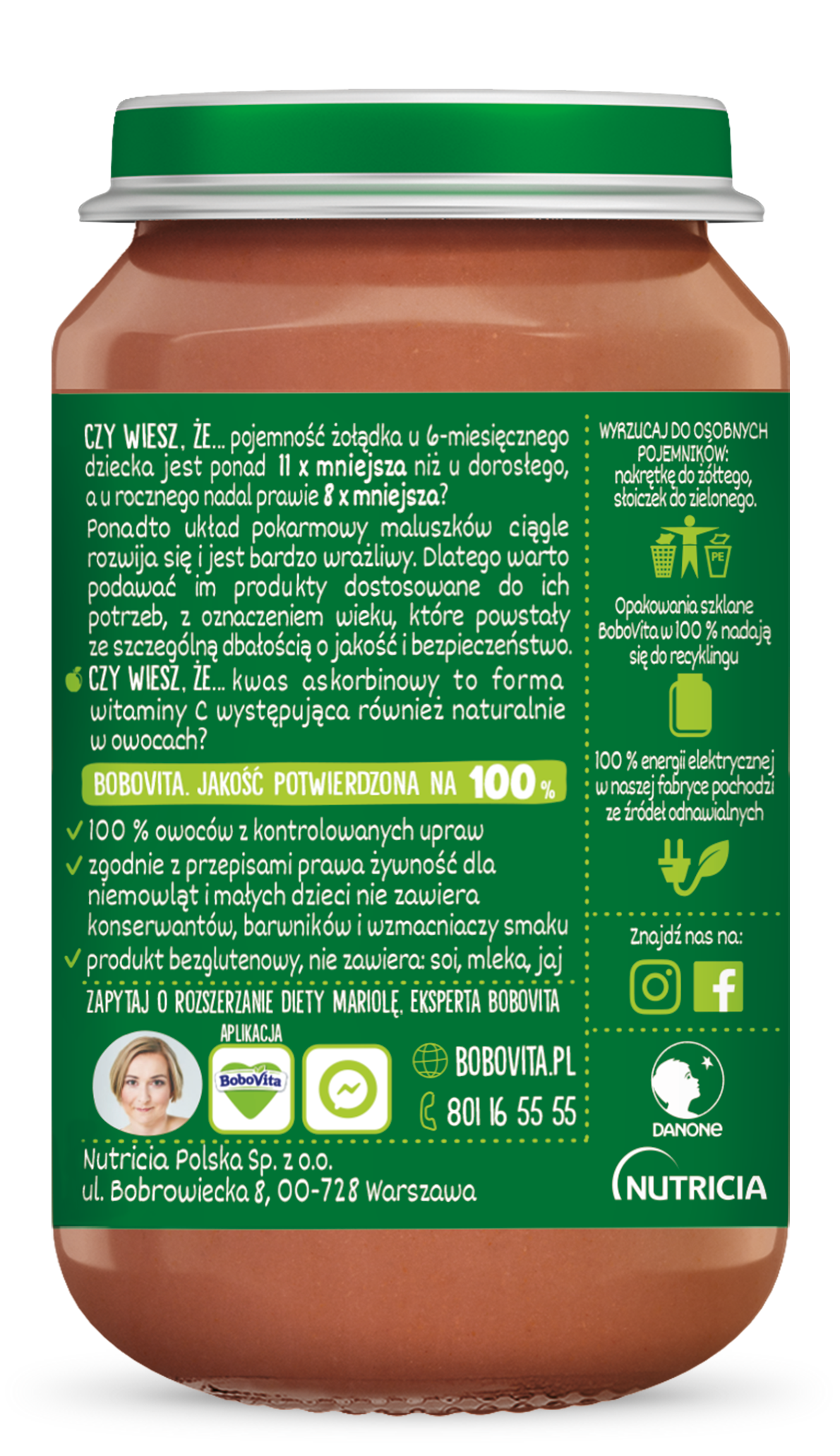 | Inne uwagi dotyczące przechowywania | Przed otwarciem przechowuj w temperaturze pokojowej. Nie używaj, jeśli można wcisnąć środek wieczka. Pozostałą część przechowuj w zamkniętym słoiczku w lodówce, nie dłużej niż 48 godzin. Nie podawaj resztek produktu, który jadło dziecko. |