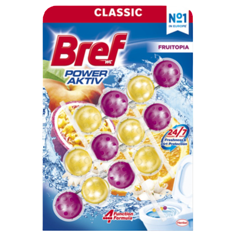 Bref Power Aktiv czyści toaletę z każdym spłukaniem, Przez 24/7 zapewnia świeżość i ochronę przed brudem utrzymującą się nawet pomiędzy spłukaniami. 4-funkcyjna formuła: 1. Aktywna piana czyszcząca toaletę podczas każdego spłukania. 2.Efekt odkamieniania zapobiegający tworzeniu się osadu z kamienia. 3. Skuteczna ochrona przed brudem i zapobieganie przywieraniu nowych zabrudzeń. 4. Wyjątkowa świeżość, która pozostaje w toalecie na dłużej.