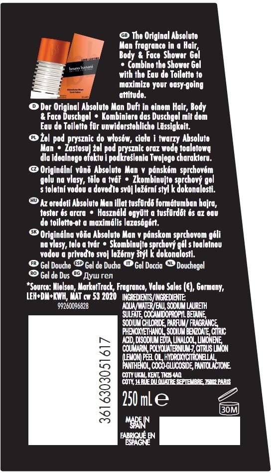 | Krótki opis marketingowy | Żel pod prysznic bruno banani absolute man to uwodzicielskość, która przychodzi bez wysiłku. zapach otwiera rześki, pobudzający powiew energii pochodzącej z akordu gazowanego napoju energetyzującego. |