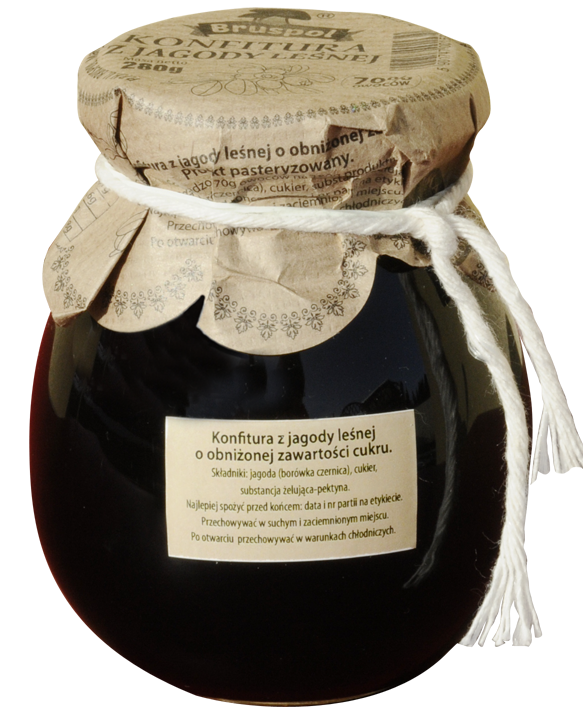 Konfitura z jagody leśnej o obniżonej zawartości cukru to produkt pasteryzowany. Sporządzono z 70 g owoców na 100 g produktu.