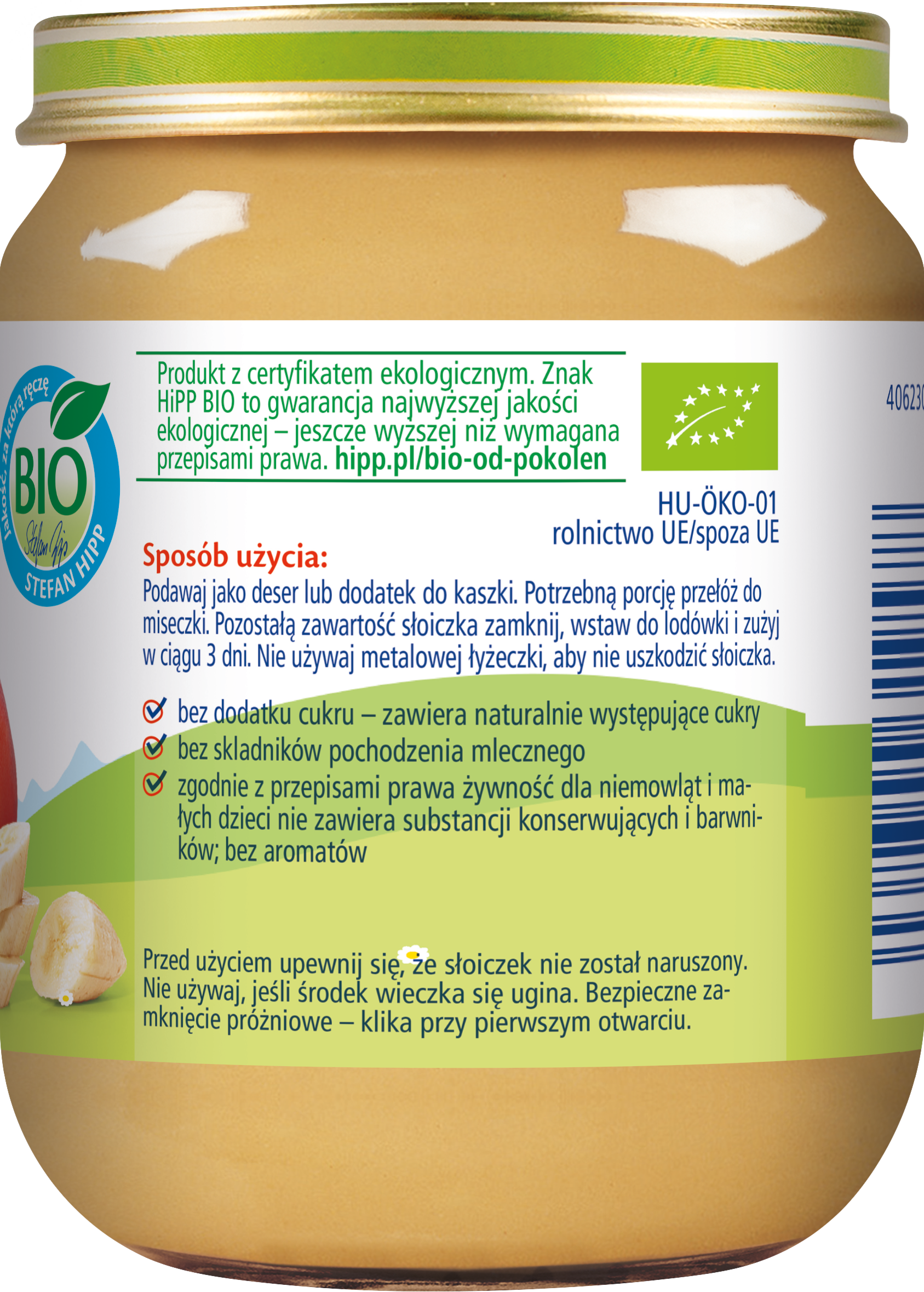 | Instrukcje dotyczące przygotowania | Sposób użycia: podawaj jako deser lub dodatek do kaszki. potrzebną porcję przełóż do miseczki. pozostałą zawartość słoiczka zamknij, wstaw do lodówki i zużyj w ciągu 3 dni. nie używaj metalowej łyżeczki, aby nie uszkodzić słoiczka. przed użyciem upewnij się, że słoiczek nie został naruszony. nie używaj, jeśli środek wieczka się ugina. bezpieczne zamknięcie próżniowe - klika przy pierwszym otwarciu. |