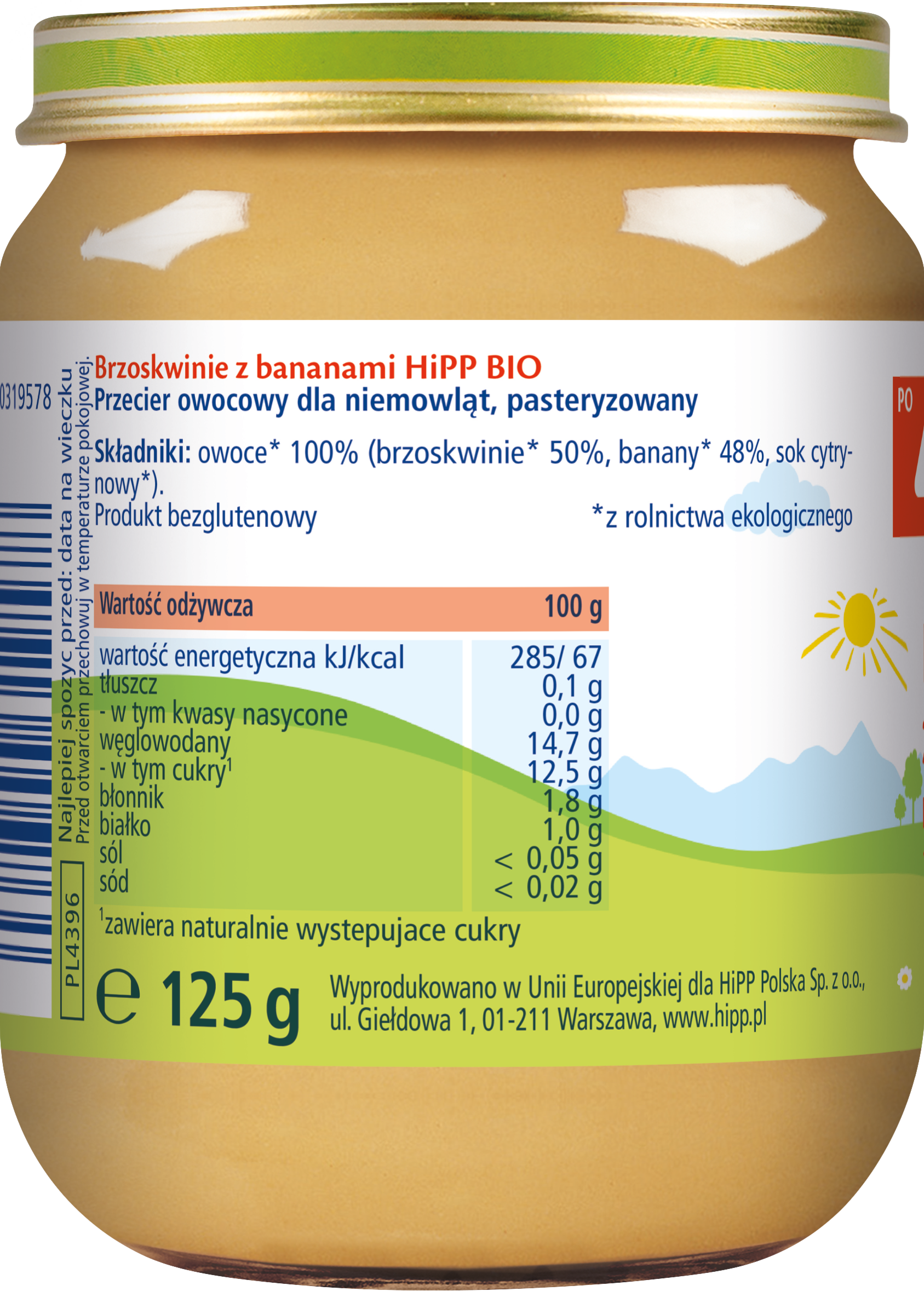 | Składniki | Owoce* 100% (brzoskwinie* 50%, banany* 48%, sok cytrynowy*) *z rolnictwa ekologicznego produkt bezglutenowy |