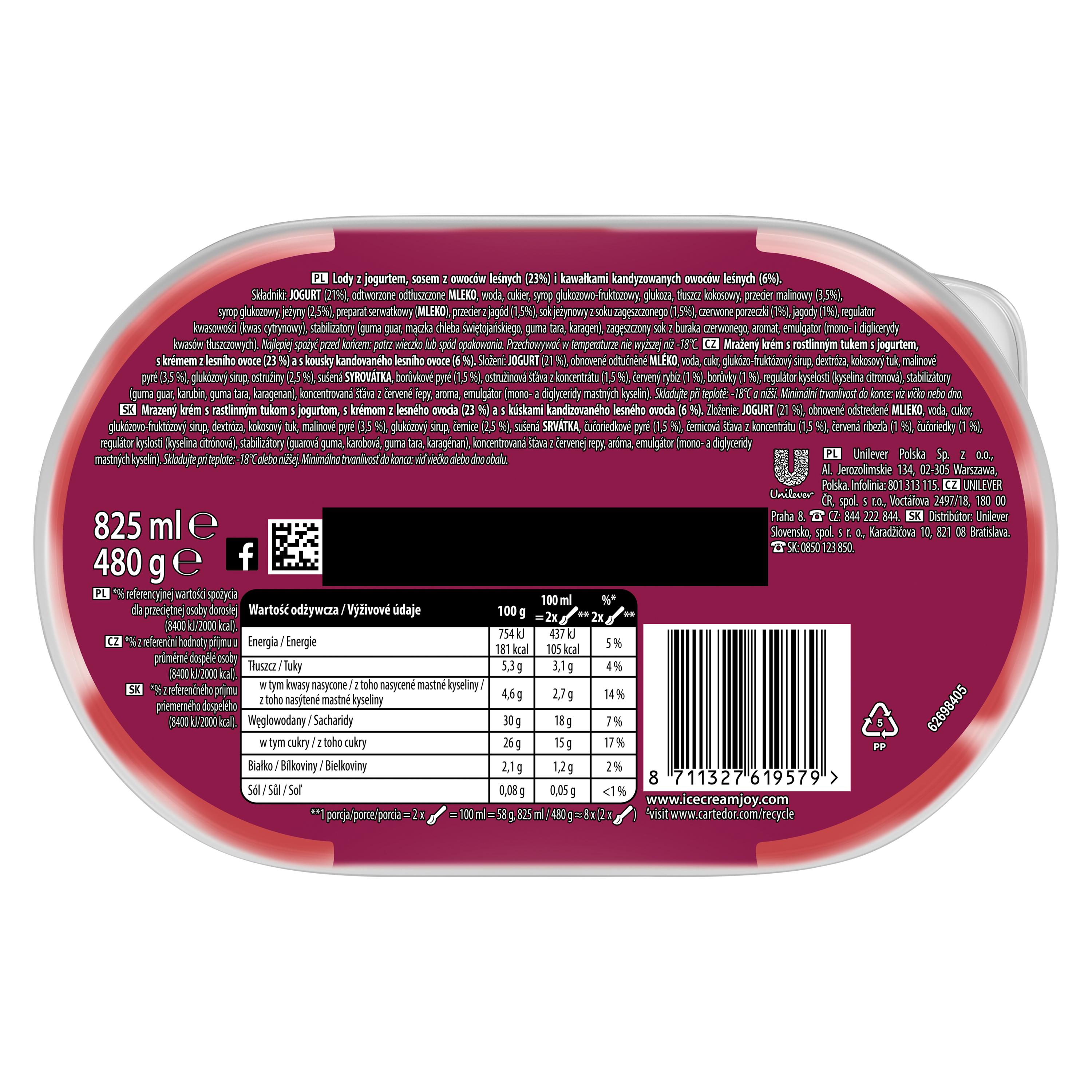 | Składniki | Jogurt (21%), odtworzone odtłuszczone mleko, woda, cukier, syrop glukozowo-fruktozowy, glukoza, tłuszcz kokosowy, przecier malinowy (3,5%), syrop glukozowy, jeżyny (2,5%), preparat serwatkowy (mleko), przecier z jagód (1,5%), sok jeżynowy z soku zagęszczonego (1,5%), czerwone porzeczki (1%), jagody (1%), regulator kwasowości (kwas cytrynowy), stabilizatory (guma guar, mączka chleba świętojańskiego, guma tara, karagen), zagęszczony sok z buraka czerwonego, aromat, emulgator (mono- i diglicerydy kwasów tłuszczowych). |