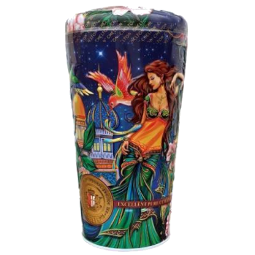 Chelton wazon Szeherezada to 100% czystej cejlońskiej czarnej i zielonej (FBOP i PEKOE) z plantacji prowincji Dimbula i Uda Pussellawa z olejkami truskawki, płatkami kandelupy szecherezada, malwy, jaśminu i róży. Ta wysokiej jakości herbata została zamknięta w estetycznej puszce z motywem głównej bohaterki “Księgi tysiąca i jednej nocy”, która może stanowić praktyczny pojemnik oraz ciekawą ozdobę.