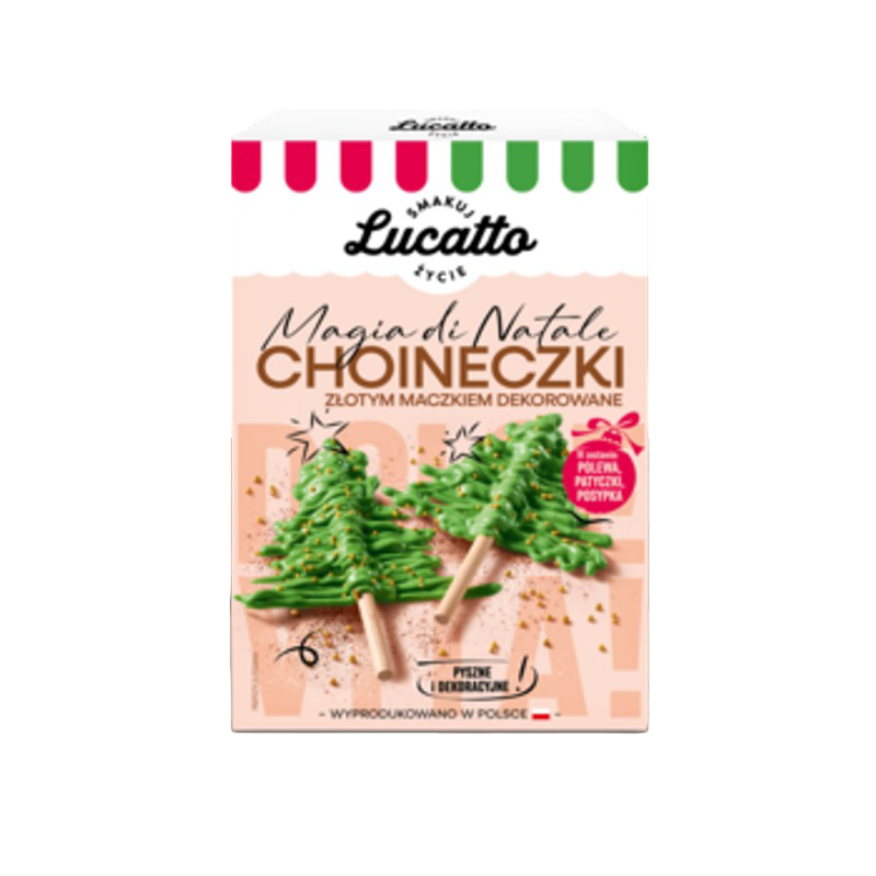 Przygotuj wyjątkowe, słodkie choineczki na patyczkach. W zestawie znajdziesz polewę, złotą posypkę i patyczki, dzięki którym w kilka chwil wyczarujesz mini-lizaki w kształcie choinek.