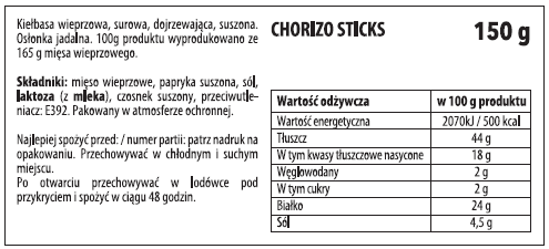 | Składniki | Mięso wieprzowe, papryka suszona, sól, laktoza (z mleka), czosnek suszony, przeciwutleniacz: e392. pakowany w atmosferze ochronnej. |
