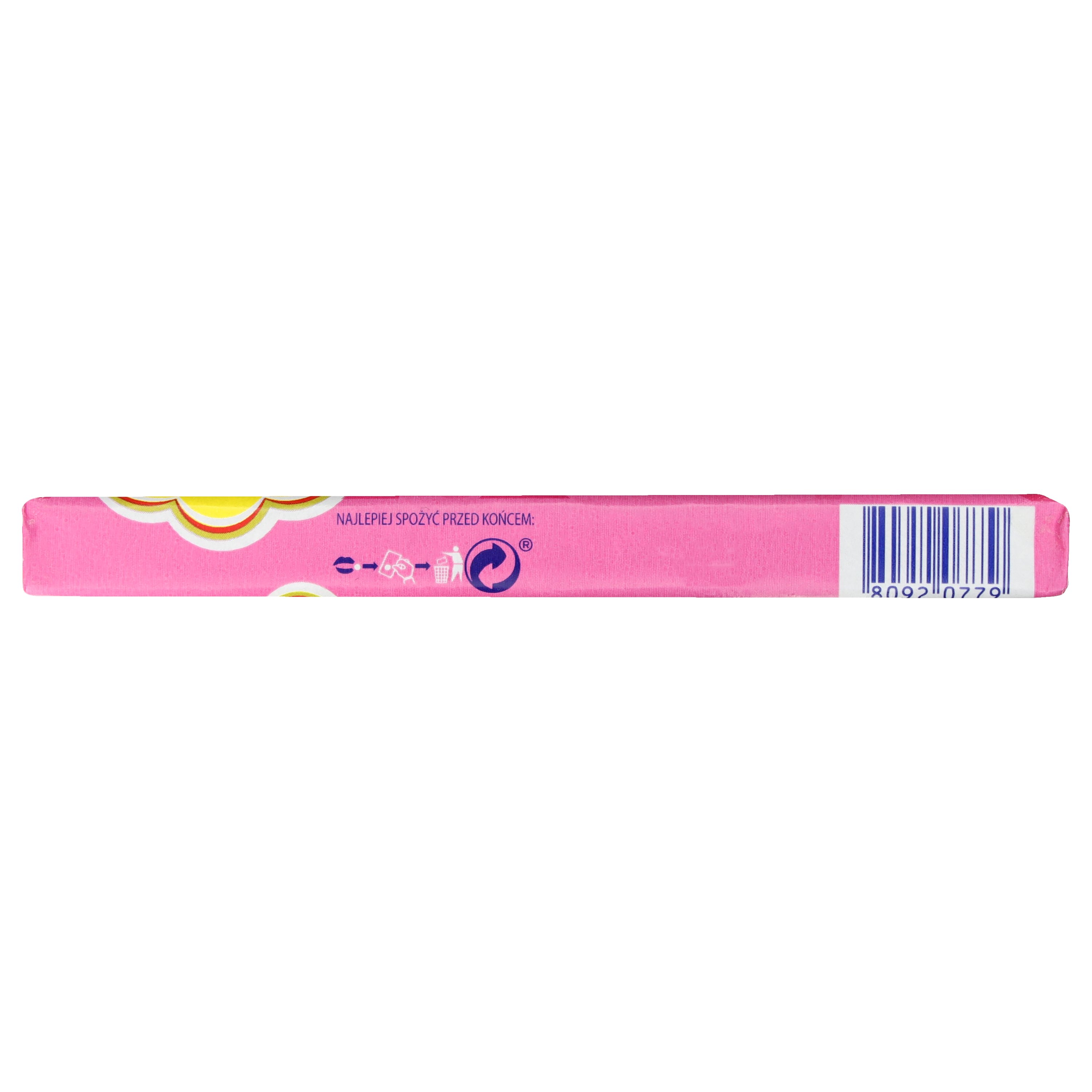 | Składniki | Składniki: cukier, baza gumowa, syrop glukozowy, stabilizator (glicerol), aromat, emulgatory (lecytyny (z soi)), estry sacharozy i kwasów tłuszczowych, przeciwutleniacz (E321), barwnik (karmin). |
