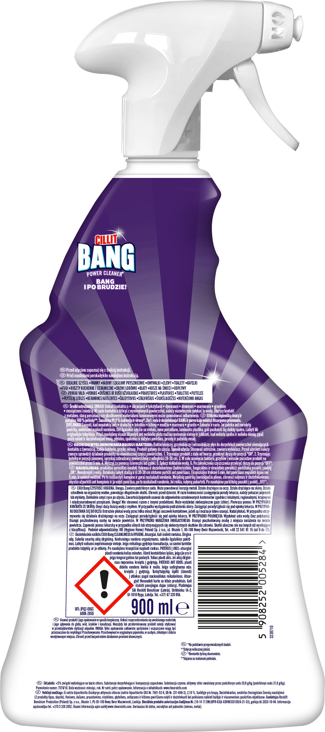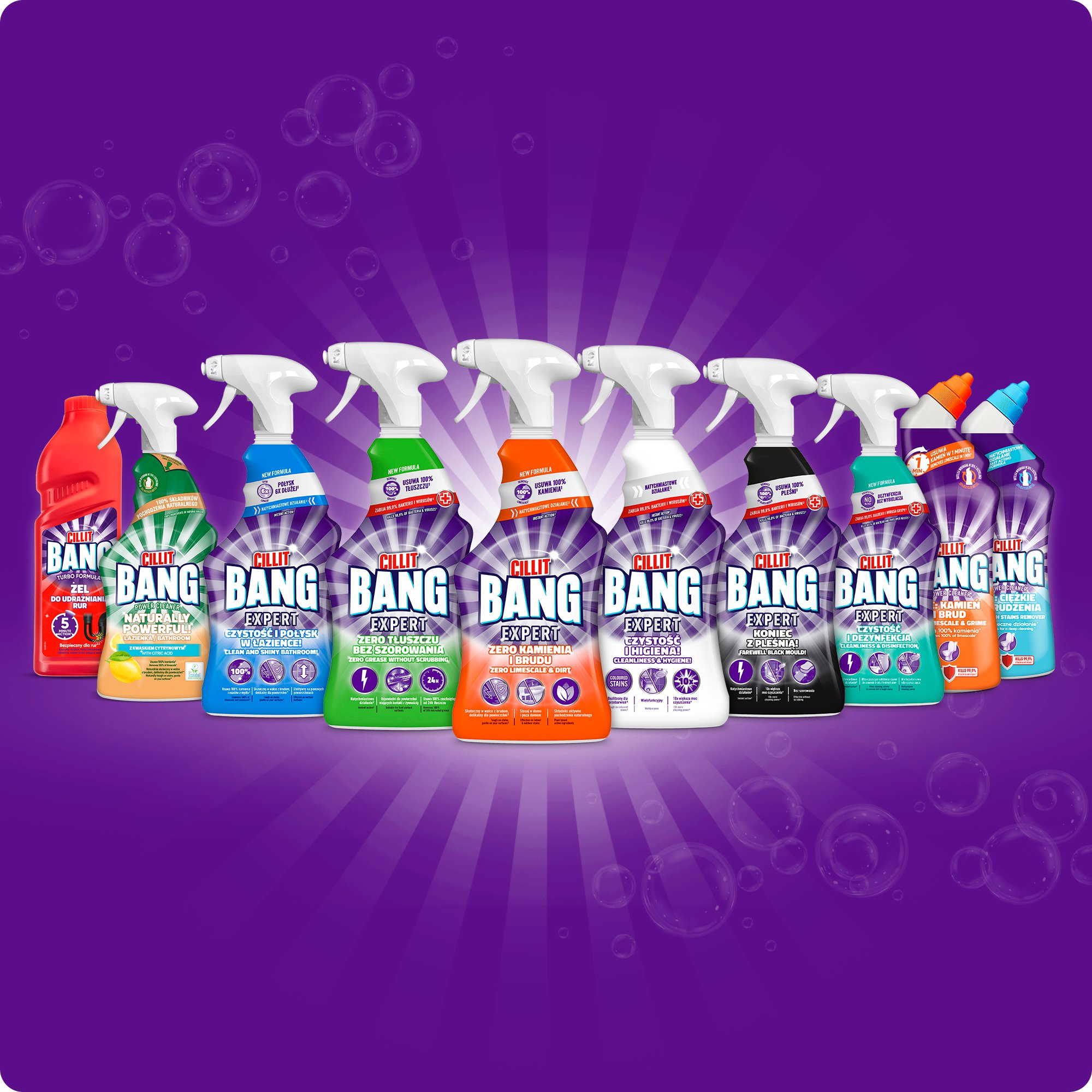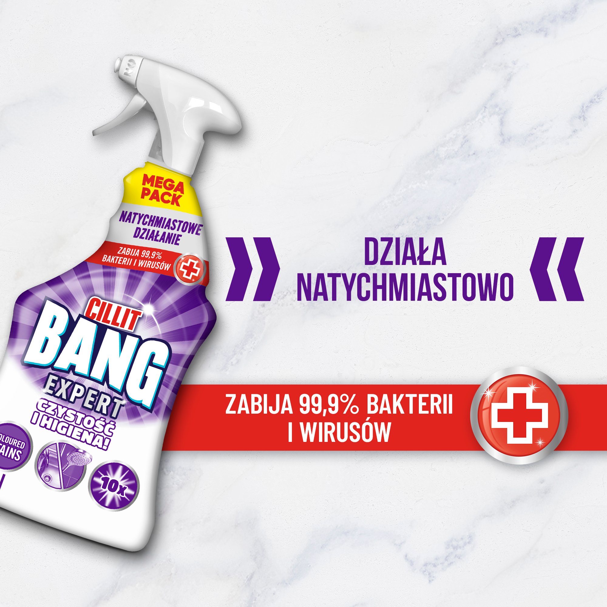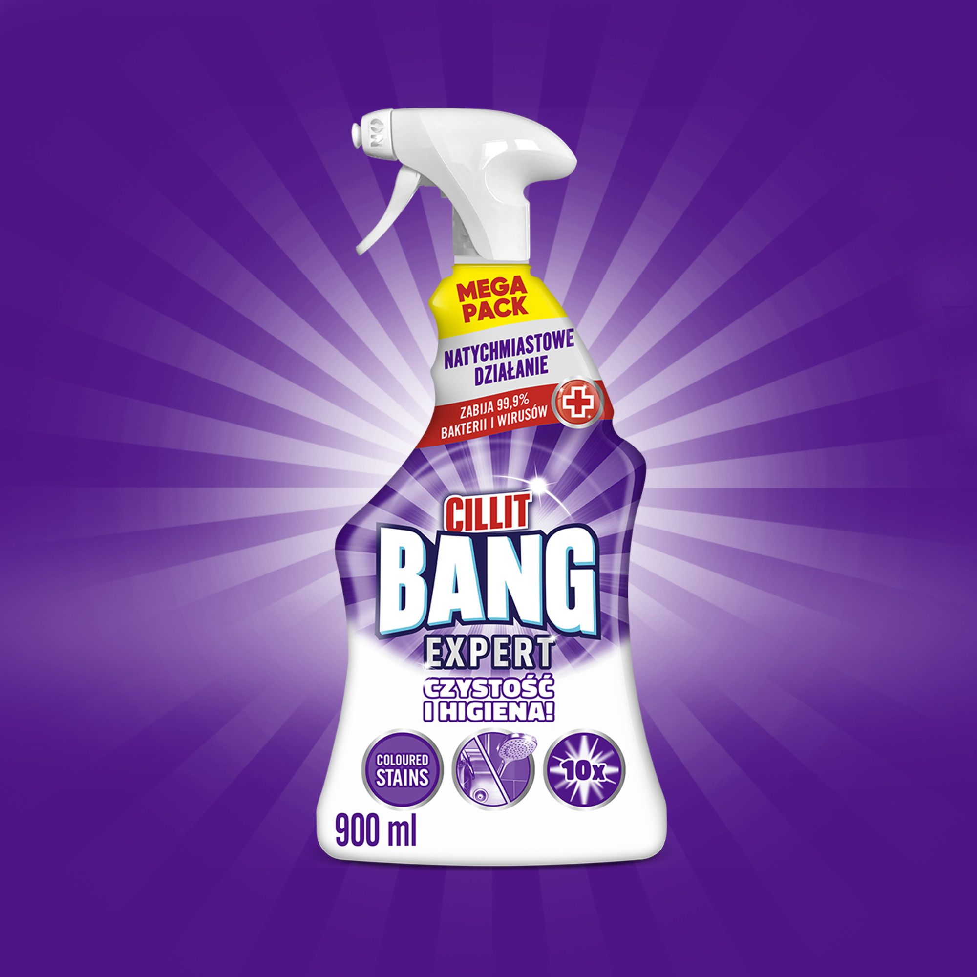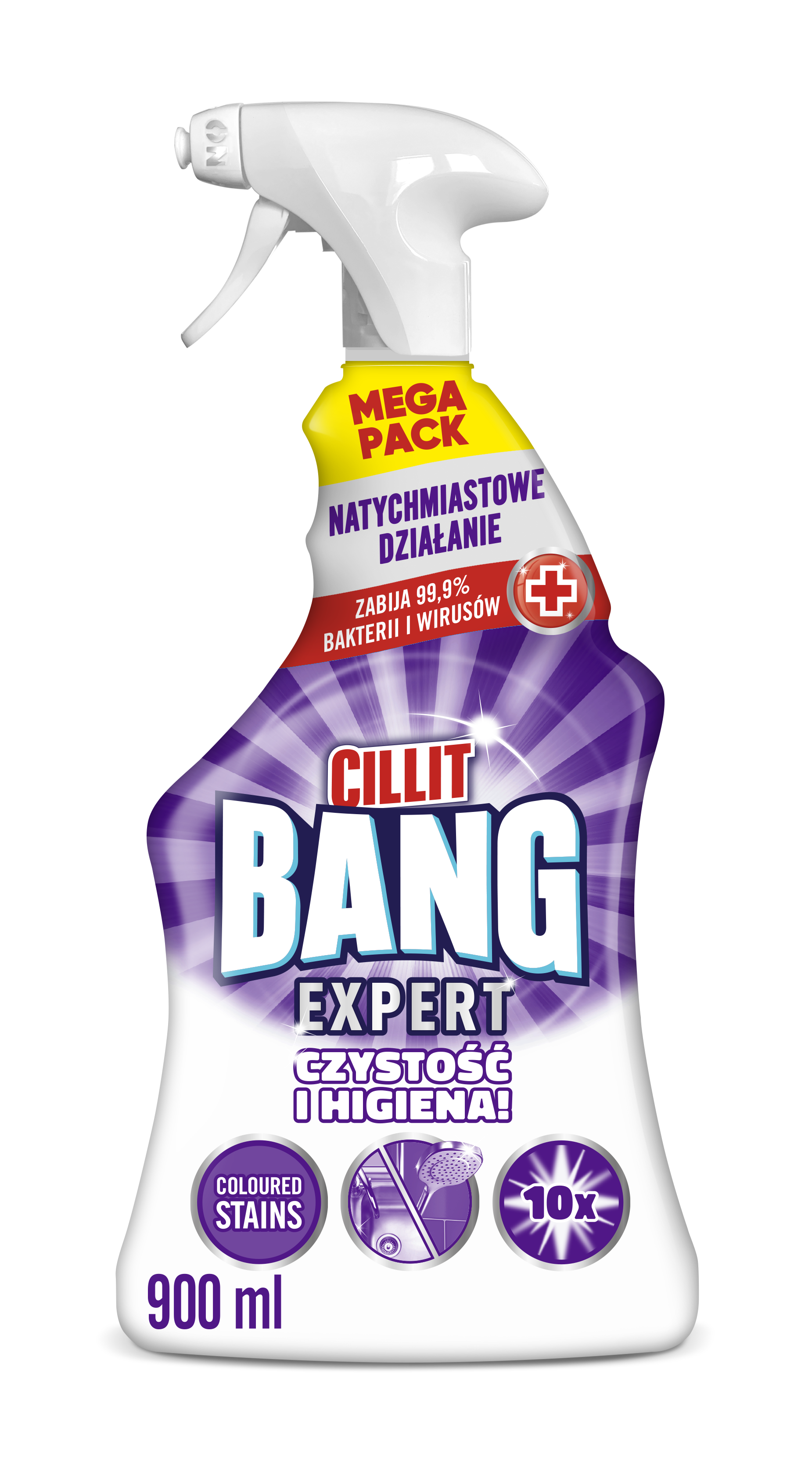 CILLIT BANG CZYSTOŚĆ I HIGIENA. Ponieważ sam wybielacz dezynfekuje, ale nie usuwa wszystkich zabrudzeń stworzyliśmy Cillit Bang CZYSTOŚĆ I HIGIENA! Jego formuła łączy w sobie wybielacz i silne środki czyszczące, aby w ciągu kilku minut wyeliminować 99,9% bakterii i wirusów*, usunąć nawet zaschnięty brud i w 100% pozbyć się pleśni, zapewniając lśniąco czysty dom na co dzień!