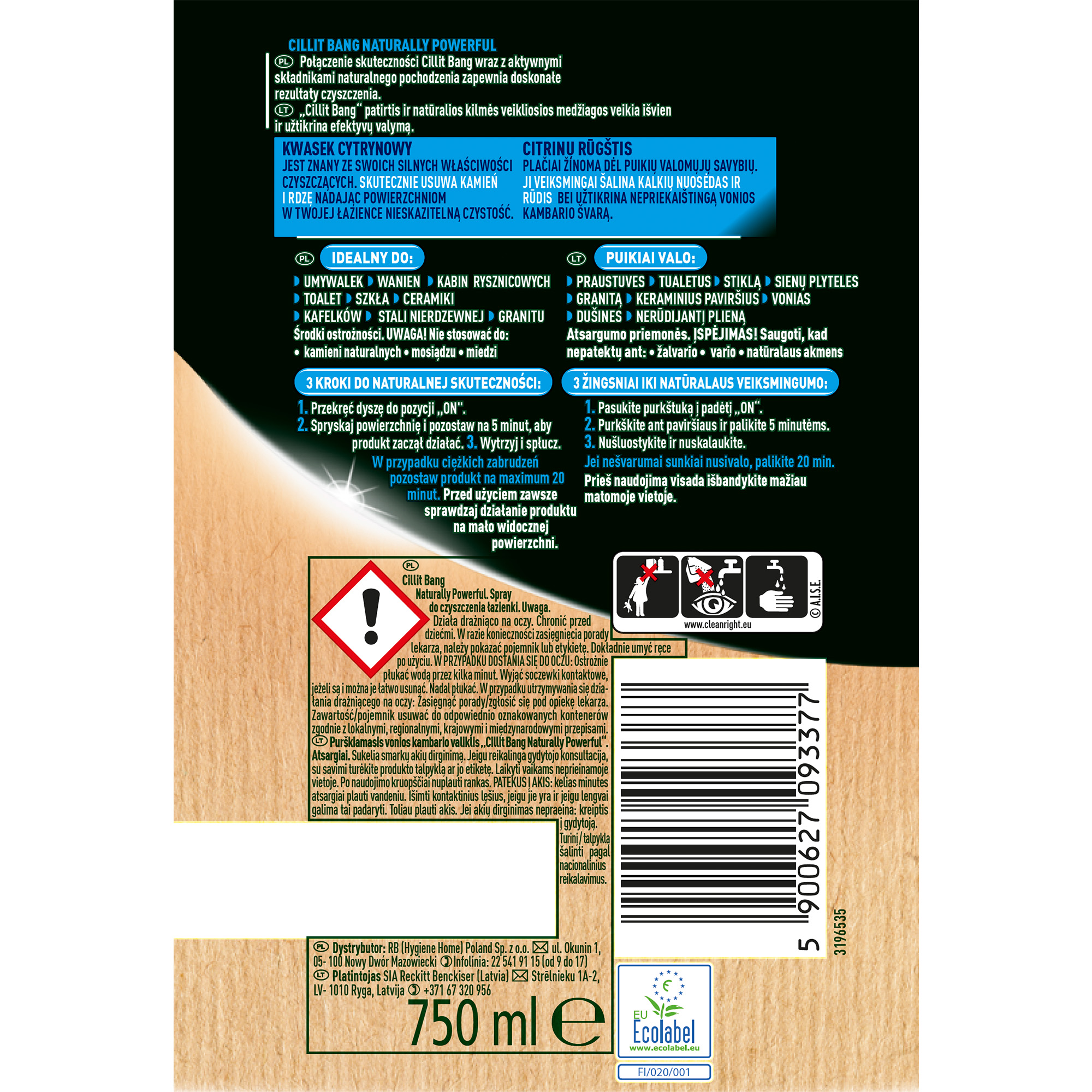 Cillit Bang Naturally Powerful Łazienka/Bathroom 750 ml – spray czyszczący do łazienki z kwaskiem cytrynowym. Nowy Cillit Bang Naturally Powerful do łazienki to połączenie sprawdzonej, silnej formuły z aktywnymi składnikami pochodzenia, które zapewniają doskonałe rezultaty czyszczenia. Jego zalety to przede wszystkim: • 100% SKUTECZNOŚCI W WALCE Z KAMIENIEM* • CERTYFIKAT EU ECOLABEL: FI/020/001 (European Flower) • KOMPOZYCJA ZAPACHOWA Z OLEJKAMI ETERYCZNYMI • SKUTECZNY SPRYSKIWACZ - W 100% RECYKLINGOWALNY • KWASEK CYTRYNOWY W NIM ZAWARTY *wg. testów na usuwanie kamienia.