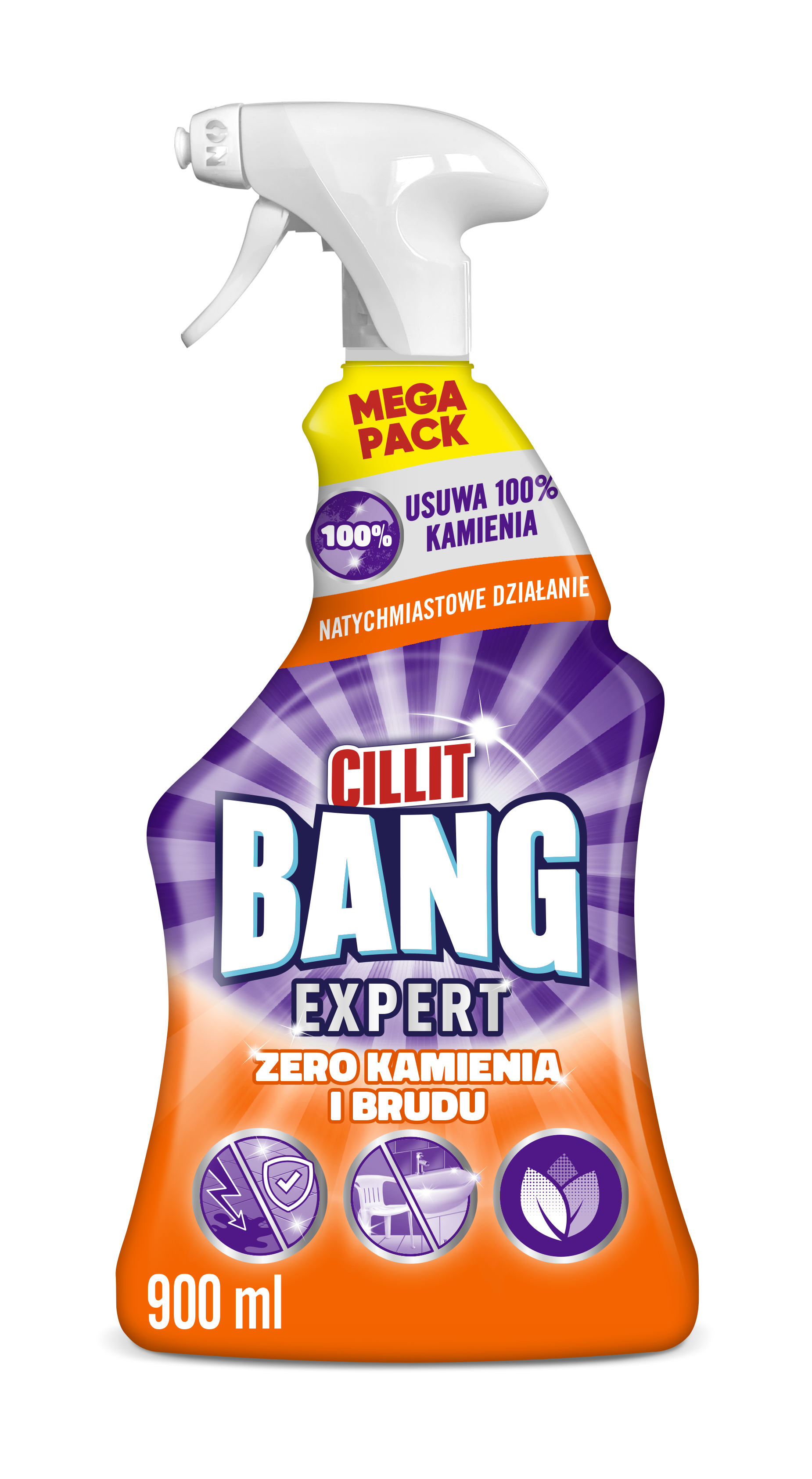 Praktyczny, wygodny i niezwykle skuteczny spray do czyszczenia łazienki i kuchni CILLIT BANG. Formuła skoncentrowana na kwasku cytrynowym usuwa 100% osadów z kamienia, a substancje aktywne pochodzenia skutecznie usuwają ponad 40 różnych zabrudzeń. W kilka sekund idealnie czyści zlewy, wanny, baterie ze stali nierdzewnej, odpływy, toalety, prysznice, kafelki, ceramiczne podłogi, powierzchnie akrylowe, szklane powierzchnie. Wygodna forma sprayu dociera do zabrudzeń w każdym miejscu. Wystarczy spryskać powierzchnię, pozostawić na 5 minut, aby produkt zaczął działać. W przypadku powierzchni silnie zabrudzonych należy odczekać maksymalnie 20 minut.