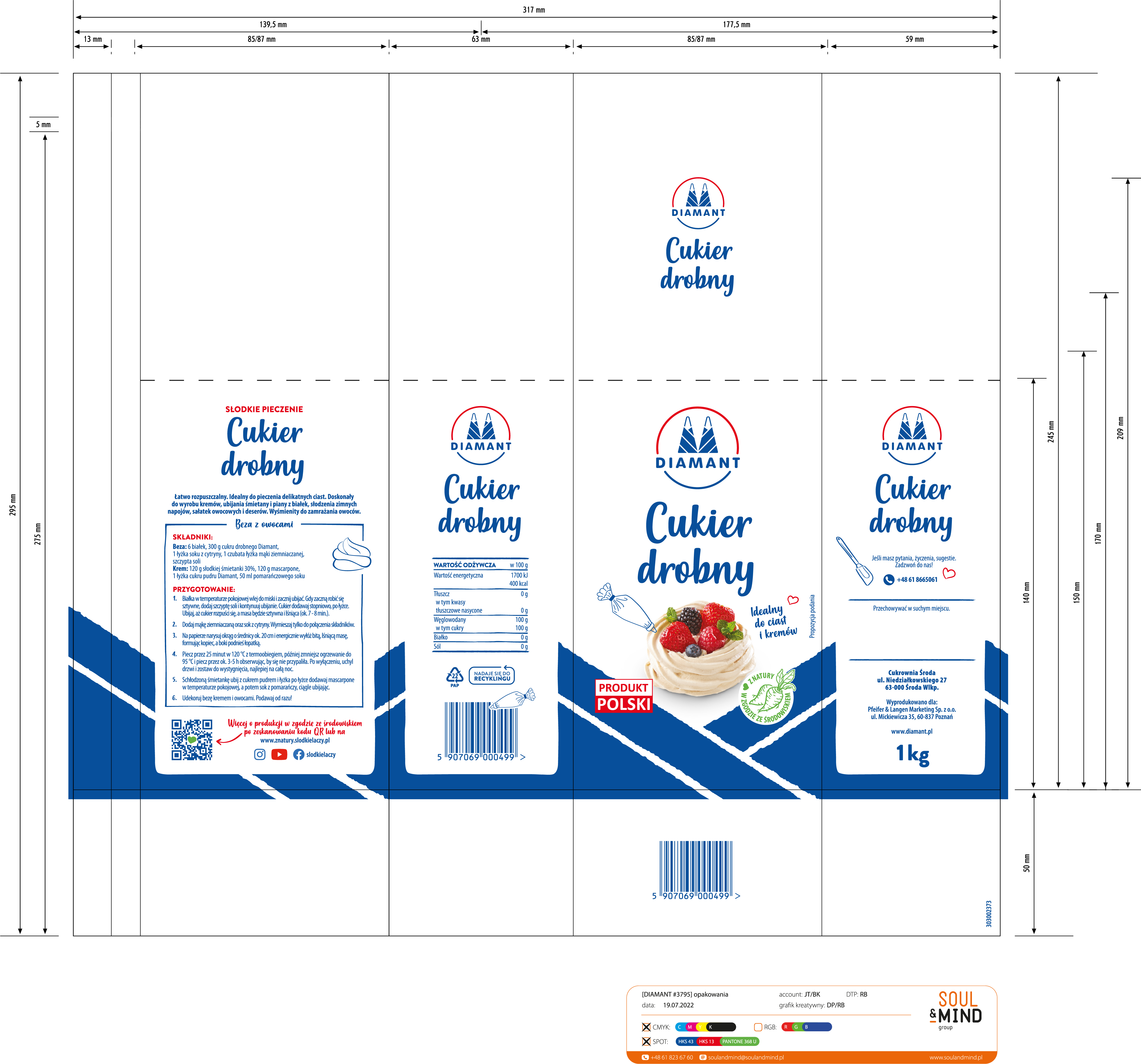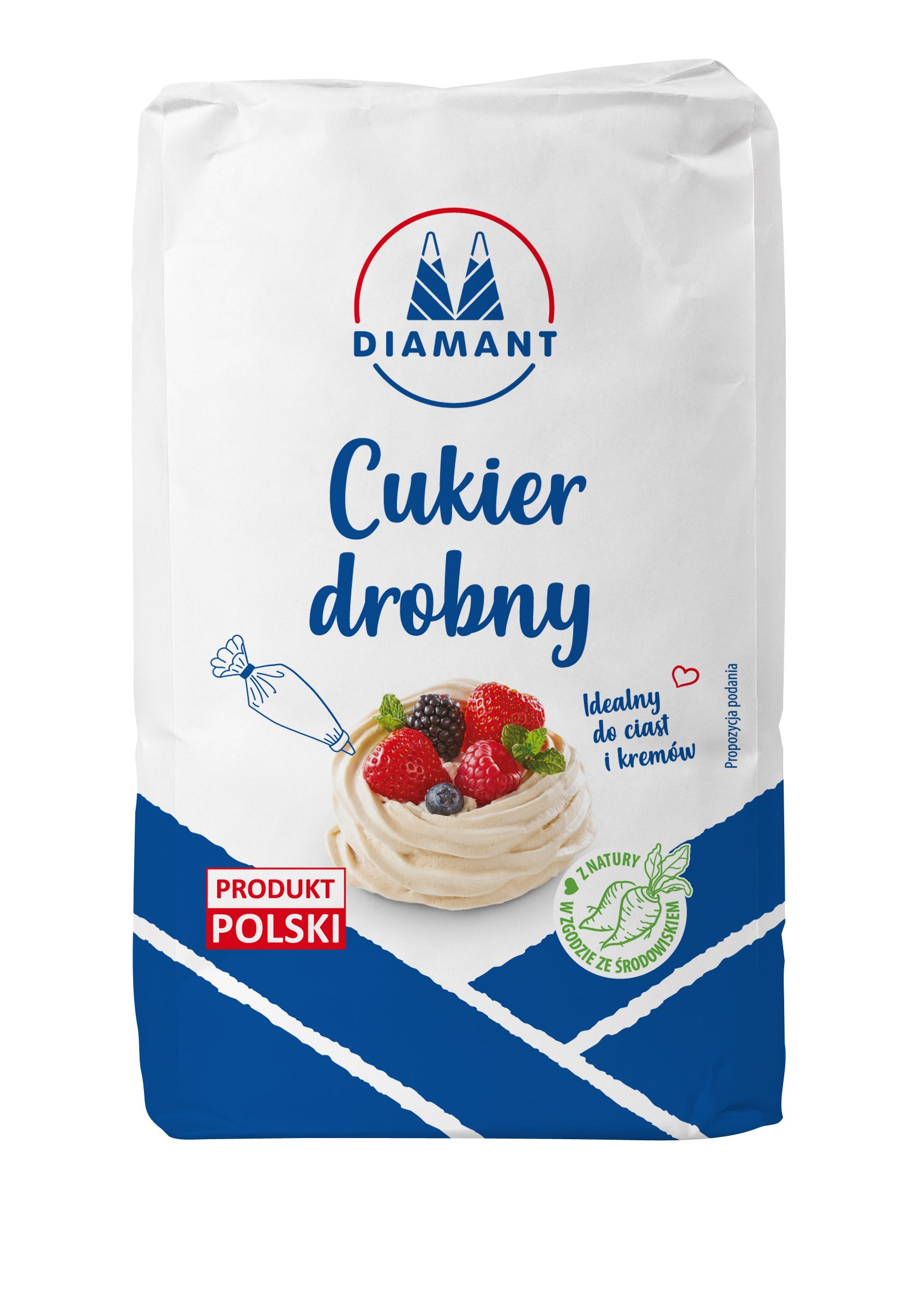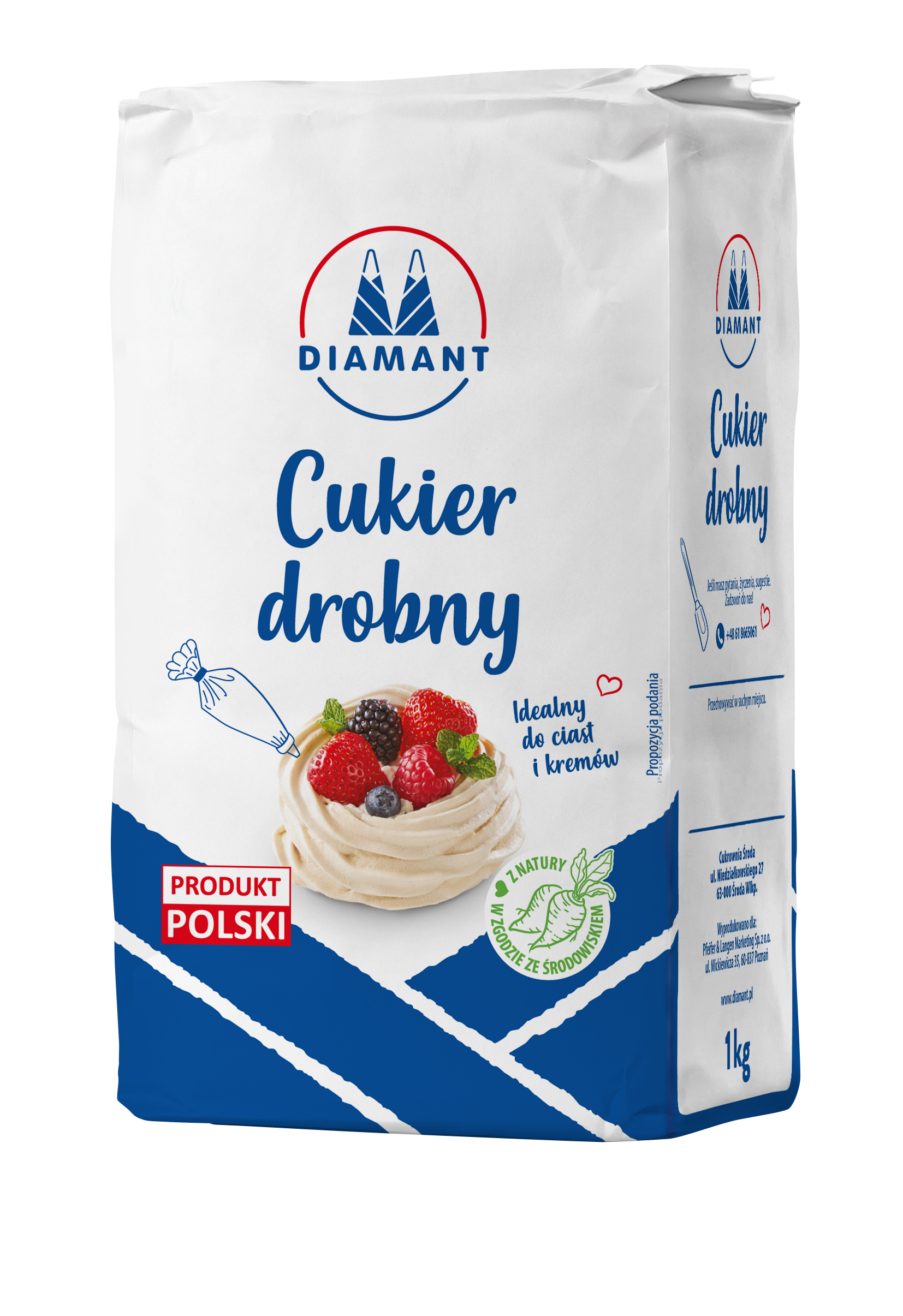 Cukier drobny bialy DIAMANT to wysokiej jakości cukier bialy o drobnej granulacji. Szybko sie rozpuszcza, dzięki czemu doskonale nadaje sie do pieczenia delikatnych ciast i biszkoptów. Jest również niezastąpiony przy wyrobie kremów, ubijaniu smietany, piany z bialek, słodzeniu zimnych napojów, świeżych owoców, sałatek owocowych oraz deserów. Doskonały także do zamrażania owoców.
