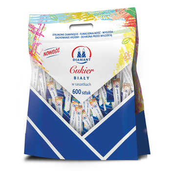 W podłużne, higieniczne, estetyczne saszetki pakowany jest drobny, łatwo rozpuszczajacy się, segregowany cukier bialy DIAMANT pierwszej kategorii. Doskonale nadaje się do hoteli, restauracji, barów, zakładów zbiorowego żywienia oraz szpitali. Doypack 3kg, w którym miesci się 600 saszetek, funkcjonalny, poręczny rodzaj opakowania dzięki swojej konstrukcji (strunowe zamkniecie - szerokie, stabilne dno – praktyczny uchwyt) oferuje komfort użytkowania i przechowywania.