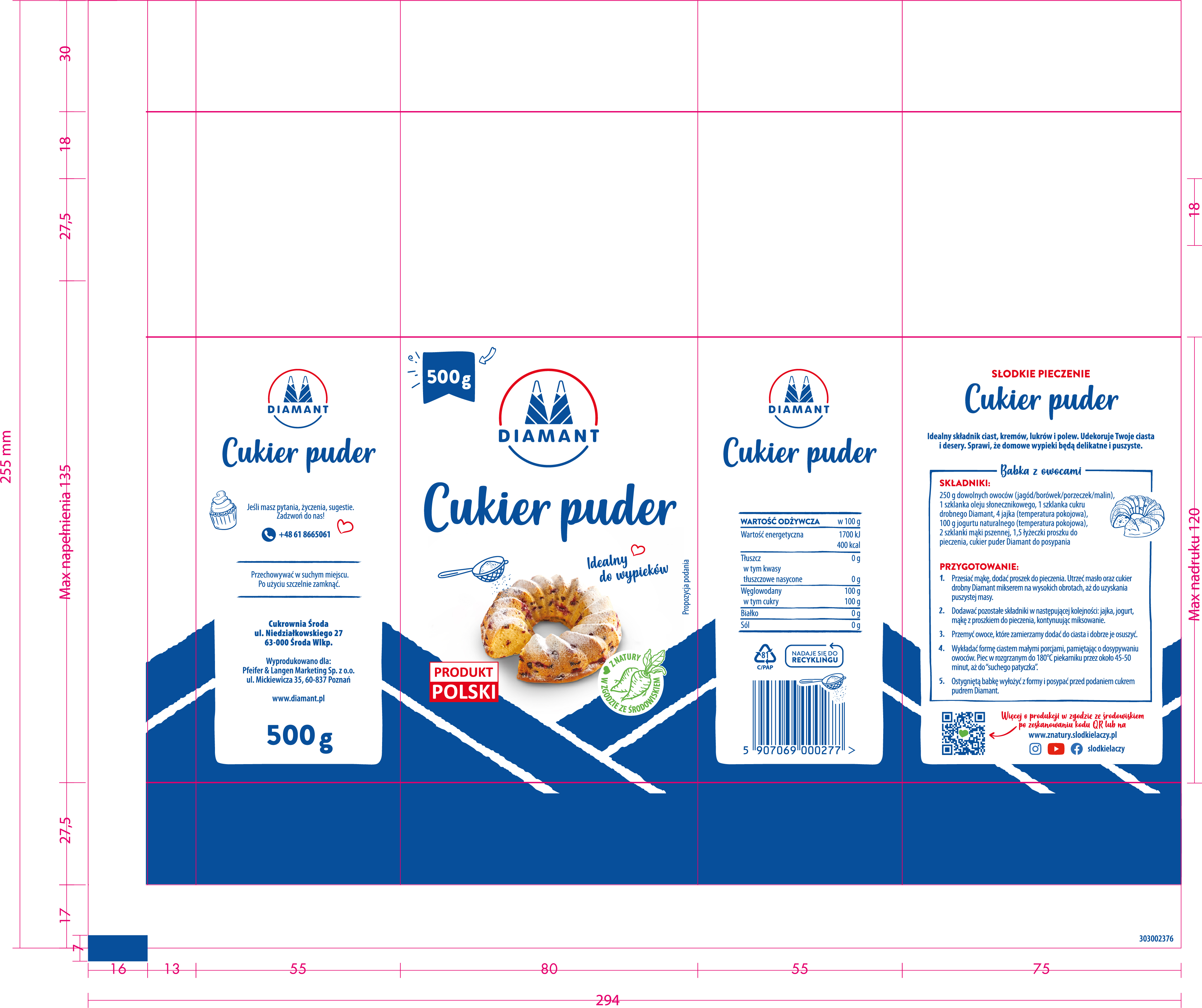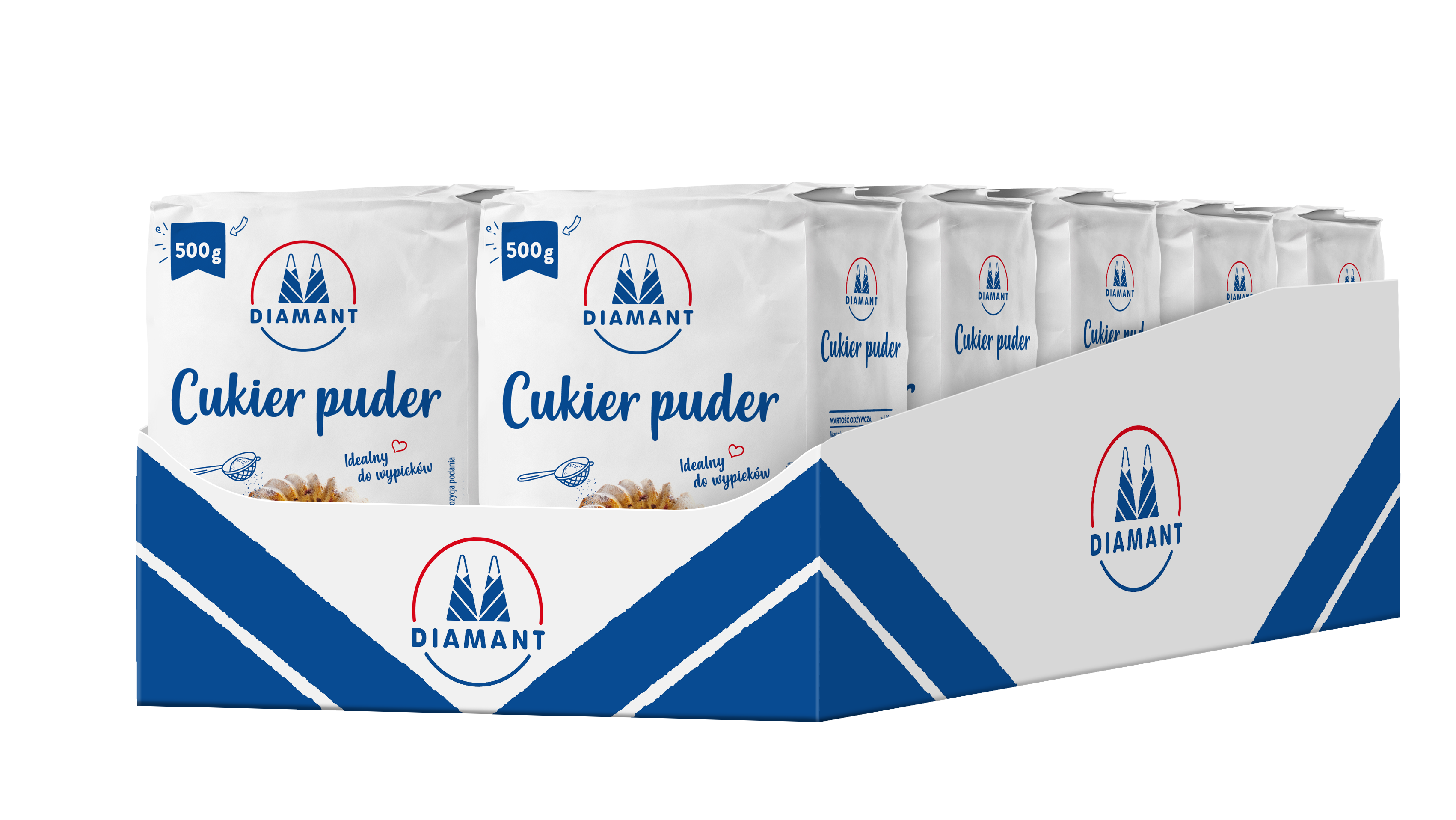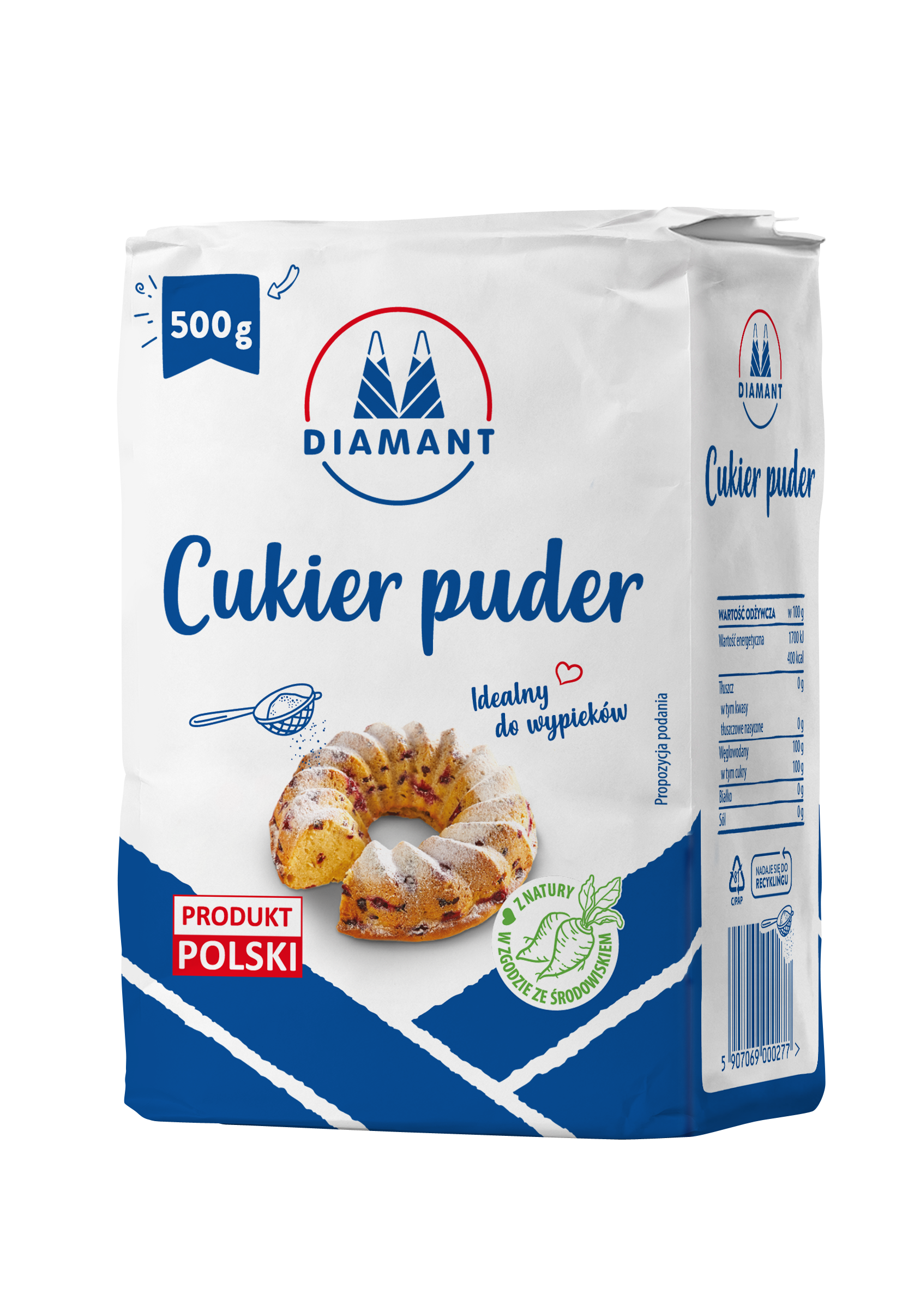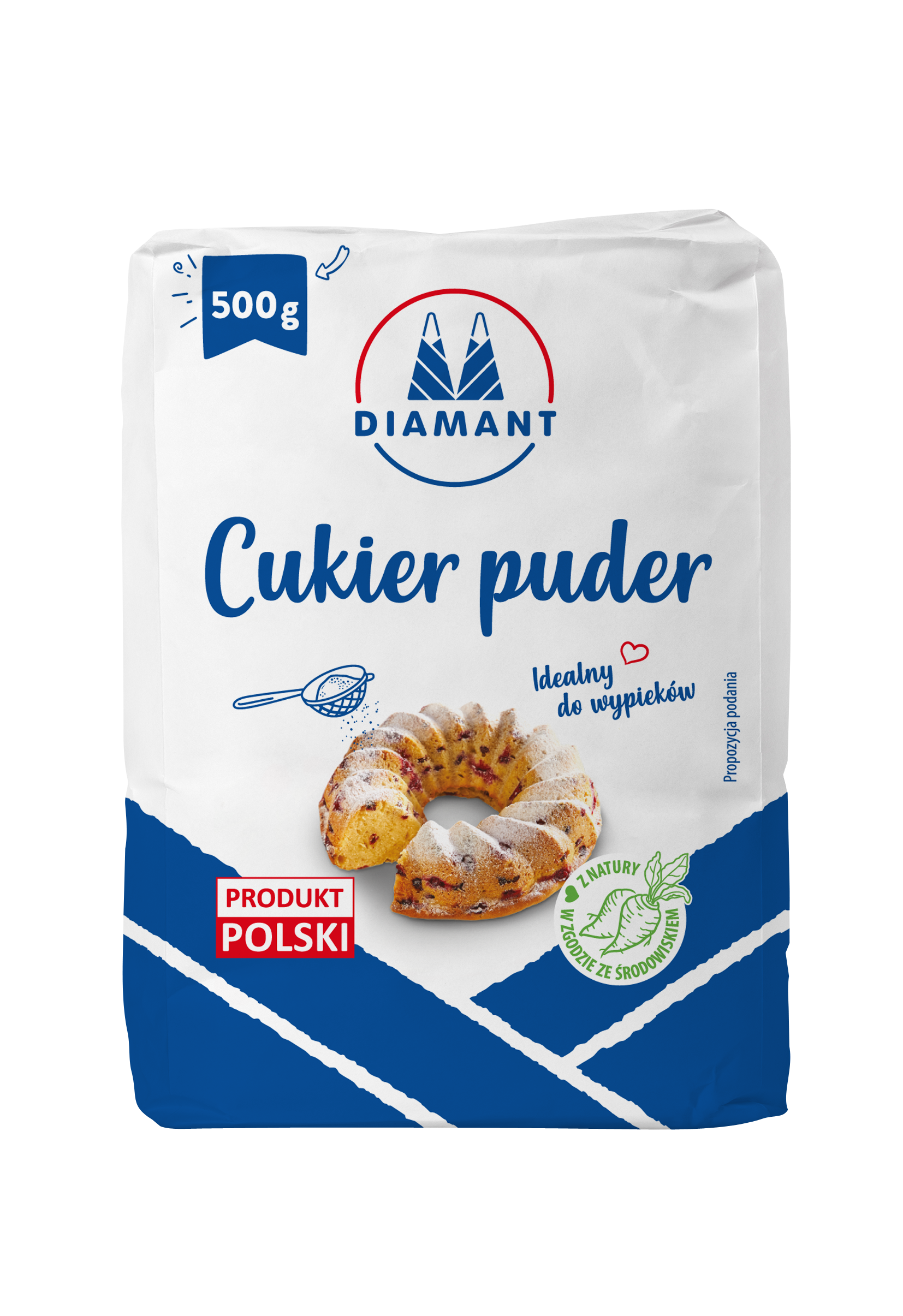 Cukier puder DIAMANT to bardzo drobno zmielony cukier kryształ. To znakomity skladnik do wypieku delikatnych i pulchnych ciast, przygotowywania lekkich kremow, bitej smietany a takze mas serowych i makowych. Doskonale nadaje sie do ozdabiania wypiekow i deserow. Swietnie rowniez sprawdza sie jako składnik lukru czy polewy, ktore dzięki niemu sa elastyczne, nie pekaja i po wyschnieciu maja intensywnie swietlisty, bialy kolor.