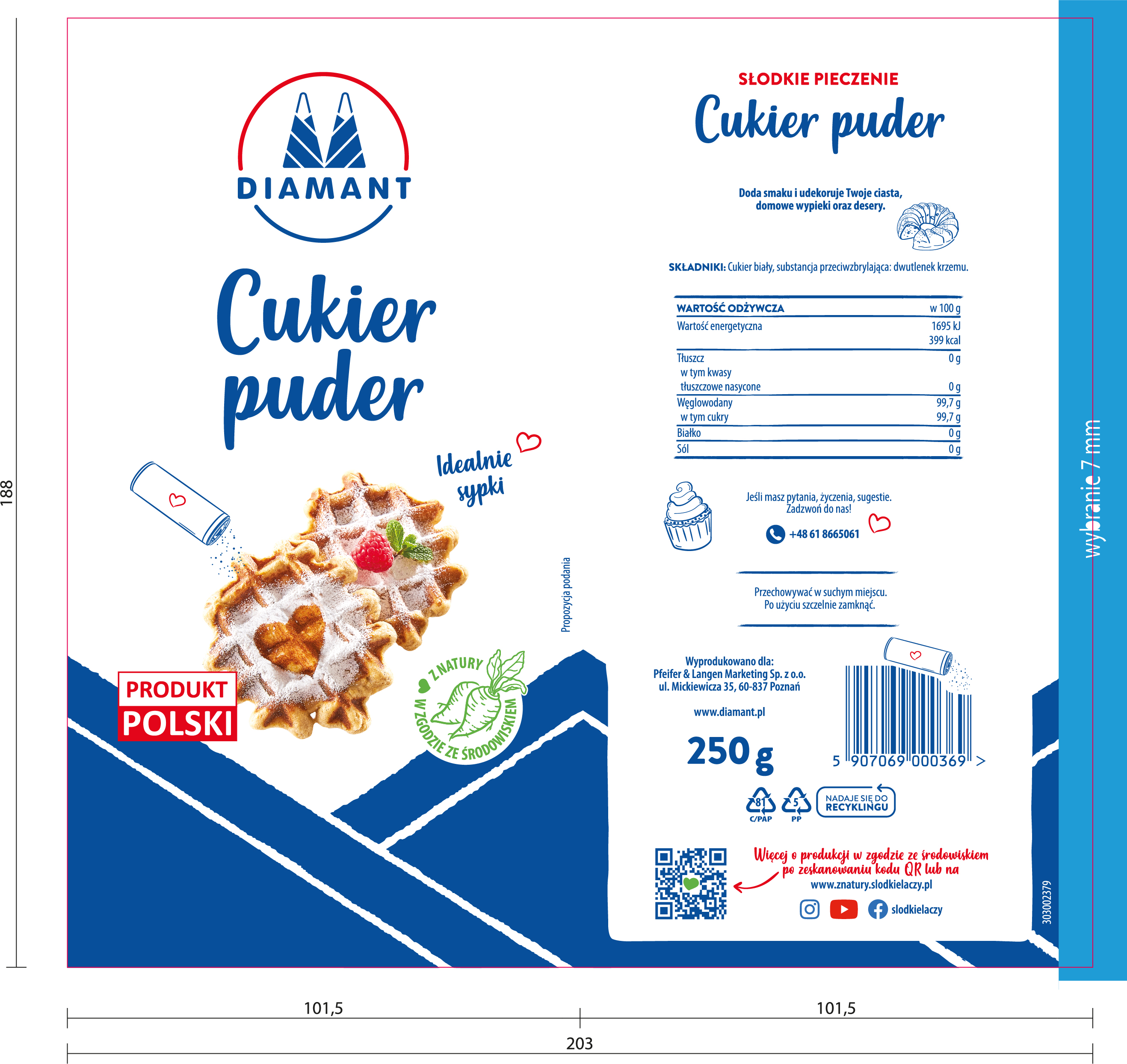 Cukier puder DIAMANT to bardzo drobno zmielony cukier krysztal. To znakomity skladnik do wypieku delikatnych i pulchnych ciast, przygotowywania lekkich kremow, bitej smietany a także mas serowych i makowych. Doskonale nadaje się do ozdabiania wypiekow i deserow. Swietnie rowniez sprawdza sie jako skladnik lukru czy polewy, ktore dzięki niemu są elastyczne, nie pekaja i po wyschnieciu maja intensywnie swietlisty, bialy kolor. Funkcjonalne opakowanie w postaci tuby ulatwia uzywanie produktu.