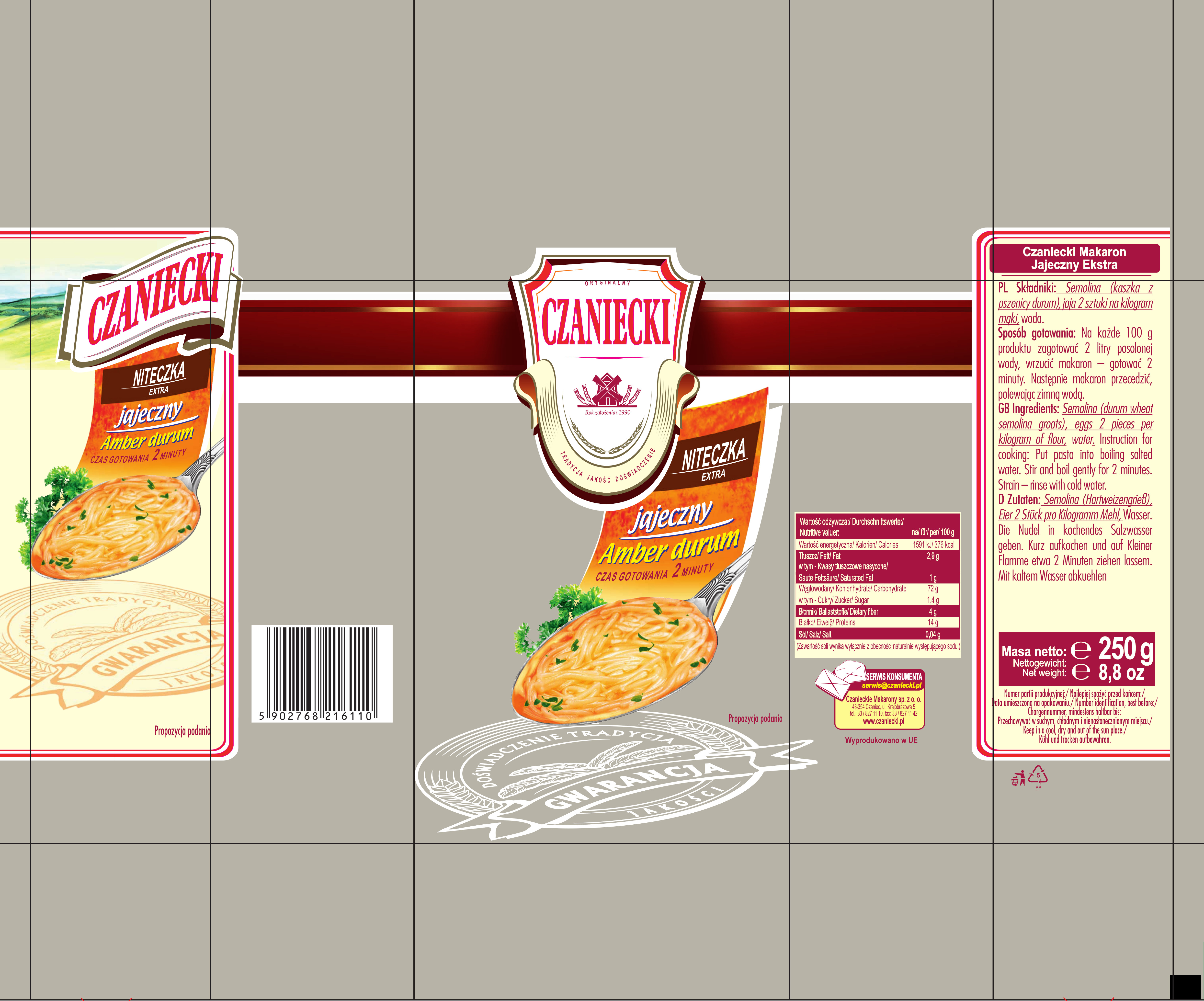 | Składniki | SEMOLINA (KASZKA Z PSZENICY DURUM), MASA JAJOWA PASTERYZOWANA CHŁODZONA 11,1 % ; WODA |