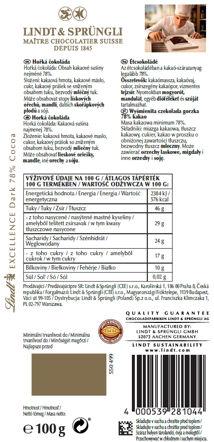 Czekolada najwyższej jakości, zawierająca 85% kakao z cukrem trzcinowym. Zawiera bogate aromaty ziarna kakaowego z intensywnym, gorzkim smakiem i aromatem lukrecji.