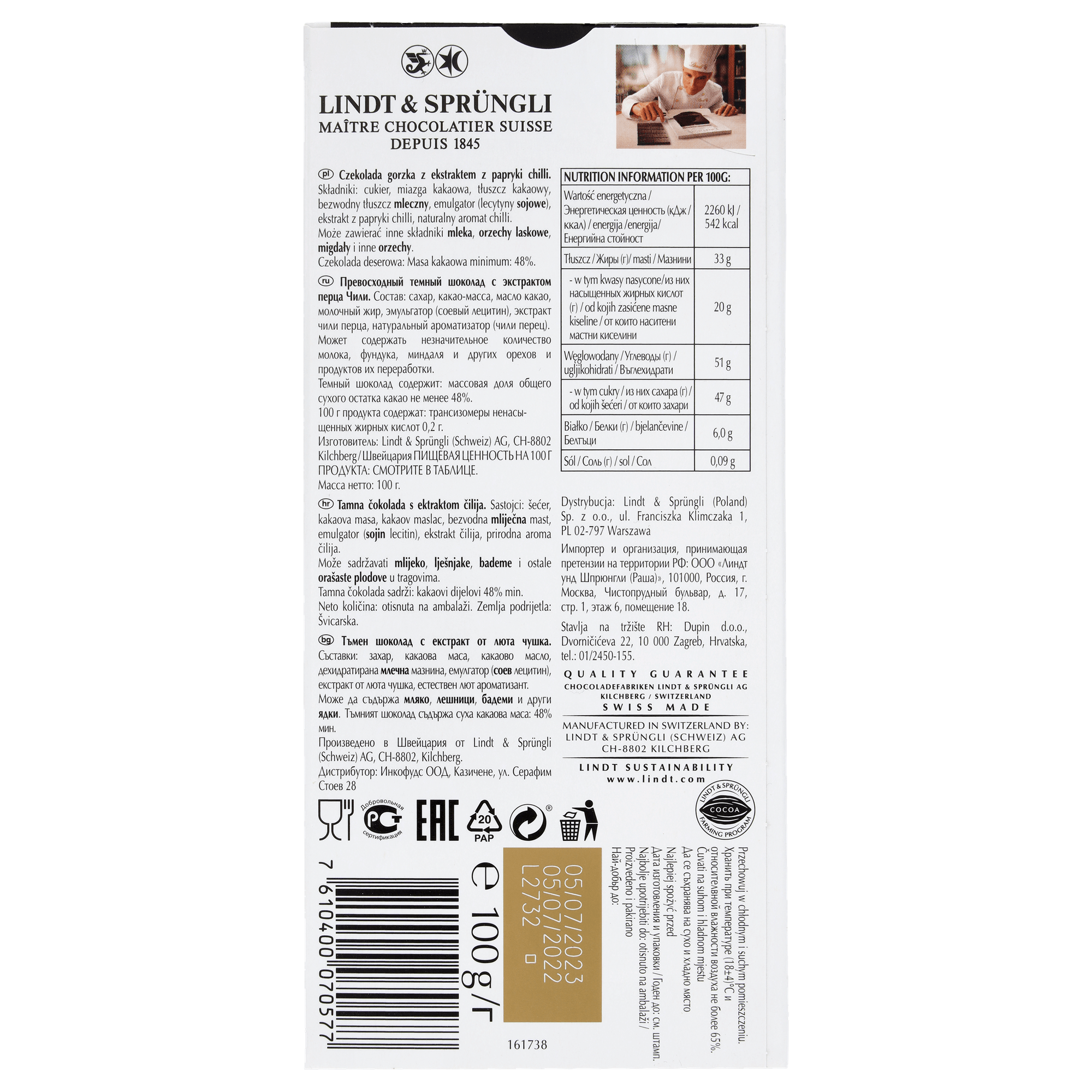 Czekolada najwyższej jakości, zawierająca 85% kakao z cukrem trzcinowym. Zawiera bogate aromaty ziarna kakaowego z intensywnym, gorzkim smakiem i aromatem lukrecji.