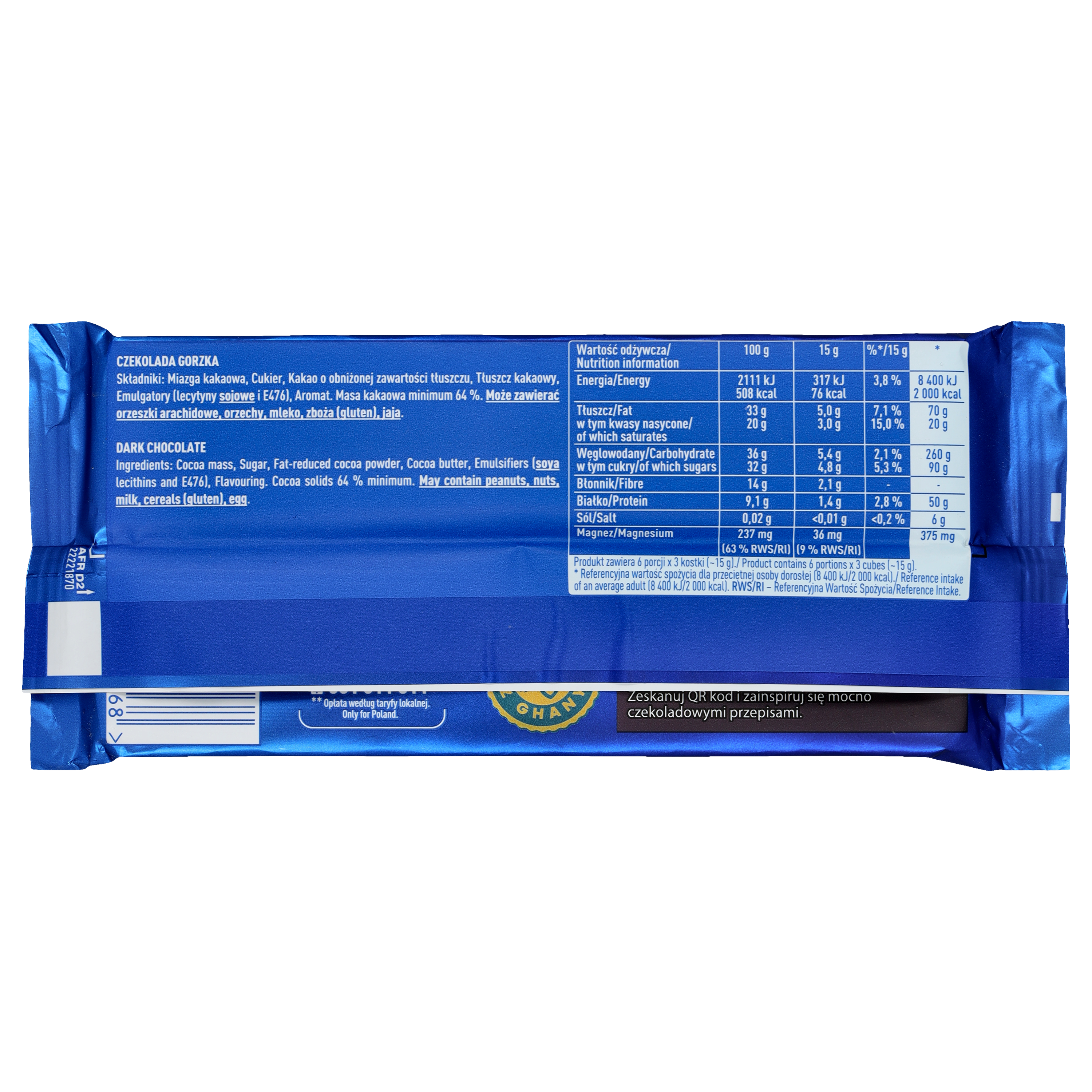 | Składniki | Miazga kakaowa, Cukier, Kakao o obniżonej zawartości tłuszczu, Tłuszcz kakaowy, Emulgatory (lecytyny sojowe i E476), Aromat. Masa kakaowa minimum 64%. Produkt może zawierać orzeszki arachidowe, orzechy, mleko, zboża (gluten), jaja. |